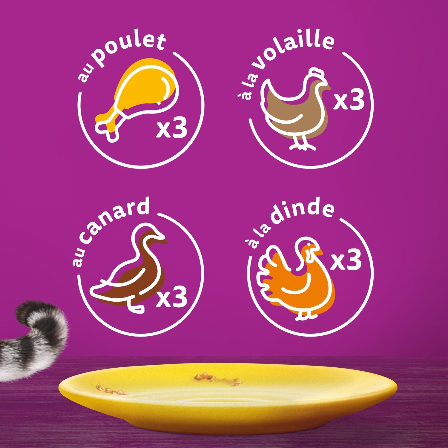 Complete wet food for senior cats from 7 years old - Also suitable for neutered cats - Whiskas® Poultry Feasts in Sauce freshness pouches 4 varieties (Chicken / Duck / Poultry / Turkey). Recipes prepared with high-quality ingredients, a delicate texture and an irresistible taste for guaranteed pleasure! Offer your cat the flavors they prefer and all the good things they need to vary the pleasures while helping them stay full of vitality and happy. A complete and balanced meal that provides your cat with the essential nutrients they need to stay in top shape: balanced minerals to contribute to normal urinary function, B vitamins and iron to keep them agile and in top shape as they age, vitamins C and E and taurine to strengthen their natural defenses. Cat food developed with our nutritionists and veterinarians at the WALTHAM® Research Center - the world's leading authority on pet nutrition and well-being. Cat food available in a convenient freshness pouch. An ideal size for providing your beloved feline with food that's always freshly served. No more clean bowls and fewer leftovers!