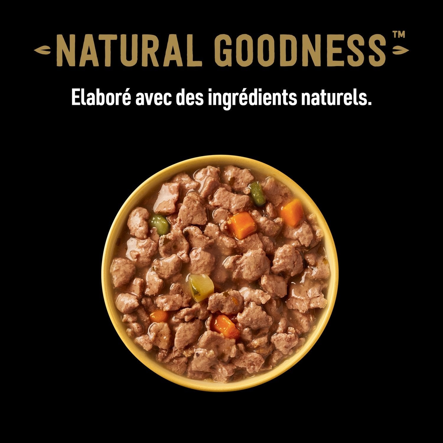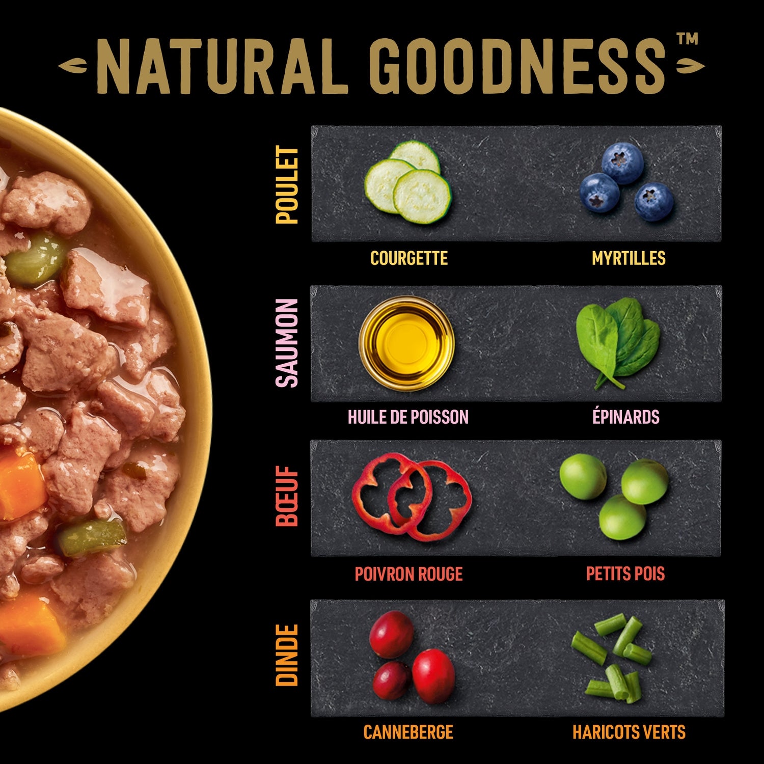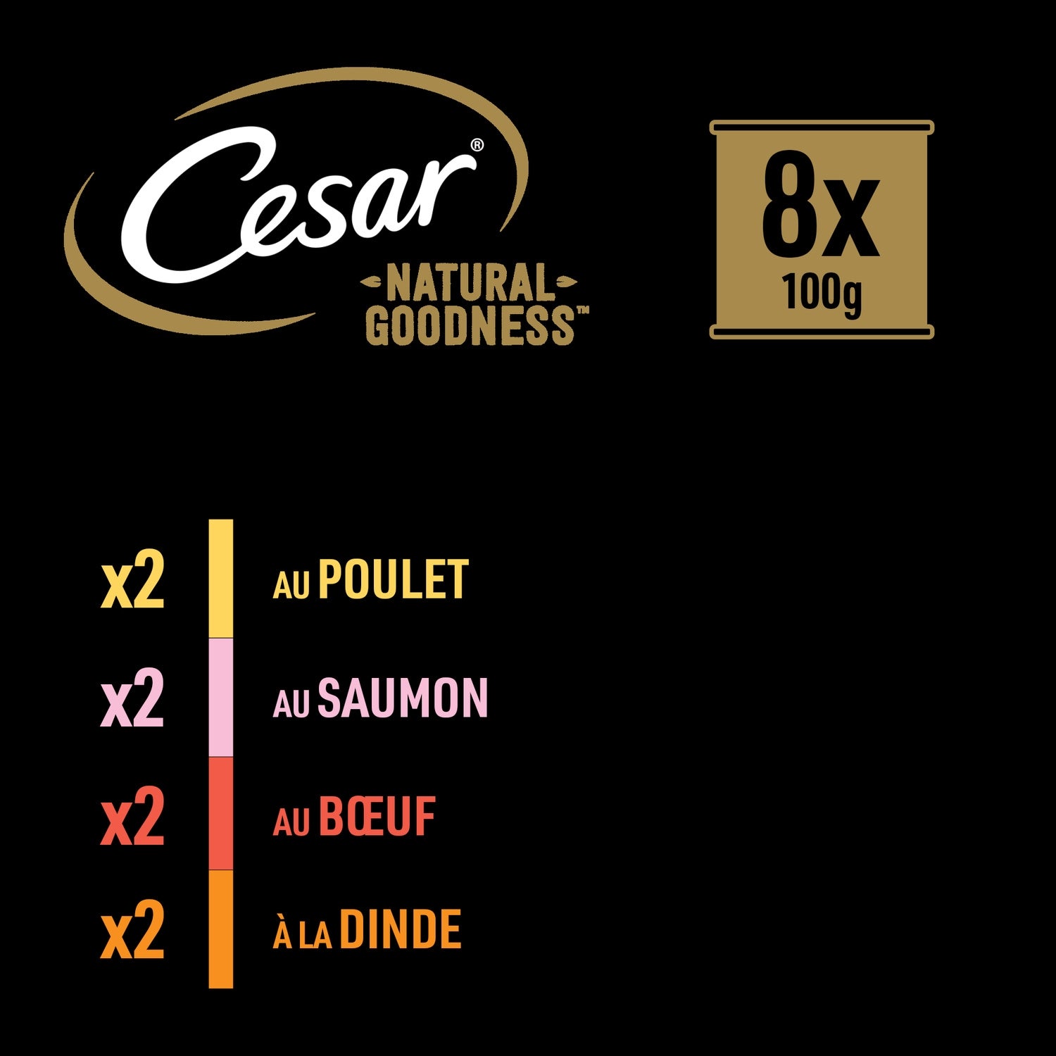 Complete food for adult dogs - 4 varieties in sauce (Chicken, Salmon, Beef, Turkey). CESAR® NATURAL GOODNESS™ Adult Casserole dog food, grain-free and with superfoods, comes in a variety of flavors. Our wet dog food is made with many vegetables and herbs and contains all the key ingredients your dog needs to help him stay in top shape (Spinach: source of iron & potassium, Fish oil: source of omega-6 fatty acids, Blueberries: source of manganese, Zucchini: source of vitamin A, Red bell pepper: source of vitamin B6, Peas: source of vitamin E, Cranberry: source of antioxidants, Green beans: source of vitamin K). Cesar® NATURAL GOODNESS™ canned dog food is 100% recyclable.