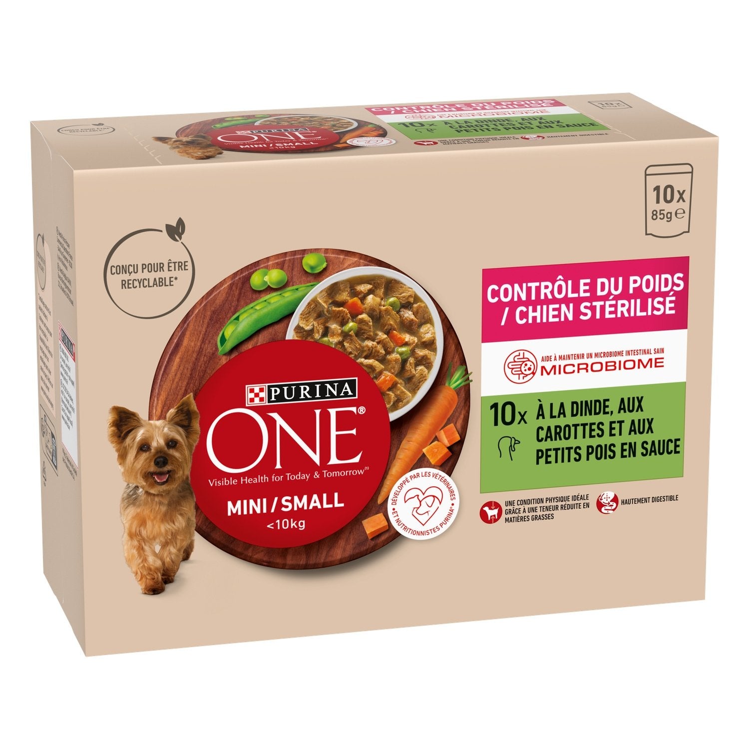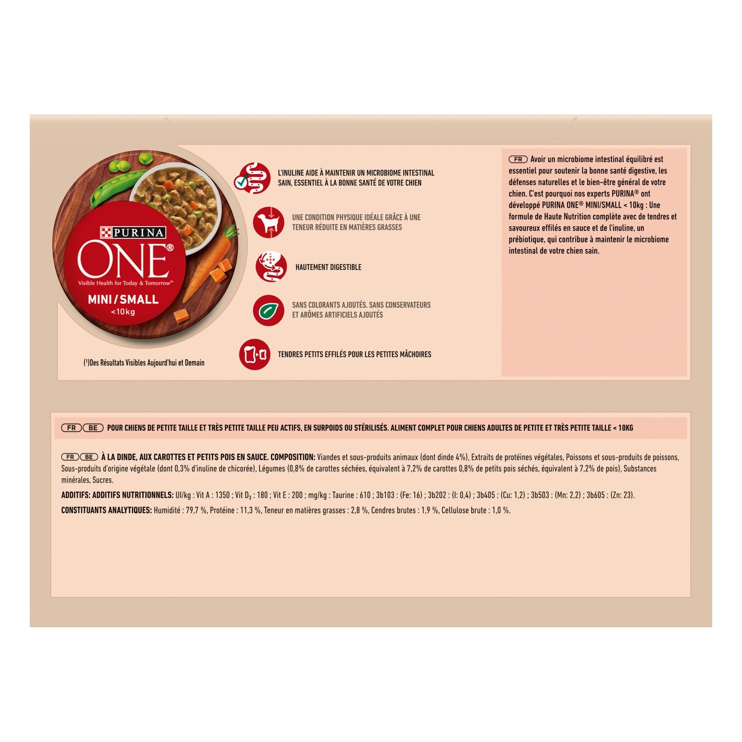 Having a balanced gut microbiome is essential to support your dog's digestive health, natural defenses, and overall well-being. That's why our PURINA experts developed PURINA ONE MINI/SMALL < 10kg: A complete High Nutrition formula containing inulin, a prebiotic, which helps maintain your dog's healthy gut microbiome.
