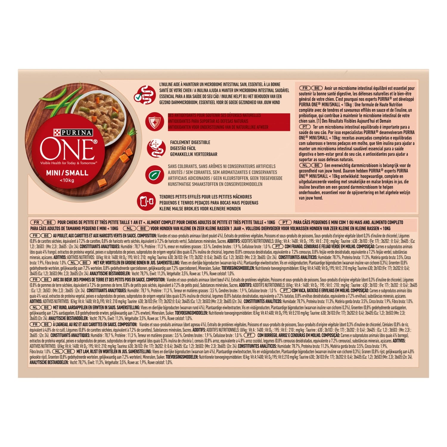 Complete food for adult dogs of small and very small breeds < 10kg,Inulin helps maintain a healthy gut microbiome, essential for your dog's good health,Tender little shreds for small jaws,Helps maintain a healthy gut microbiome,Easily digestible,No added artificial colors, flavors or preservatives.,Developed by Purina veterinarians and nutritionists