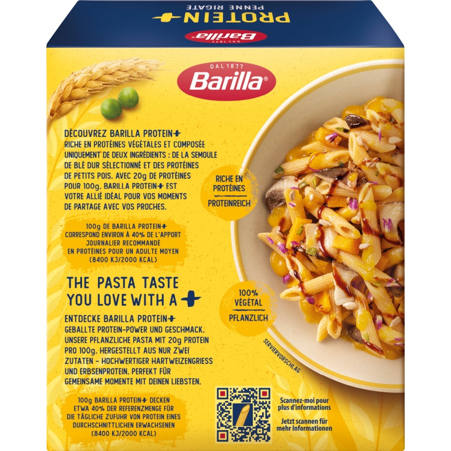 Discover Barilla Protein+ Penne Rigate! Rich in plant-based protein and made with just two ingredients: selected durum wheat semolina and pea protein. With 20g of protein per 100g, Barilla Protein+ is your perfect partner for sharing moments with your loved ones.