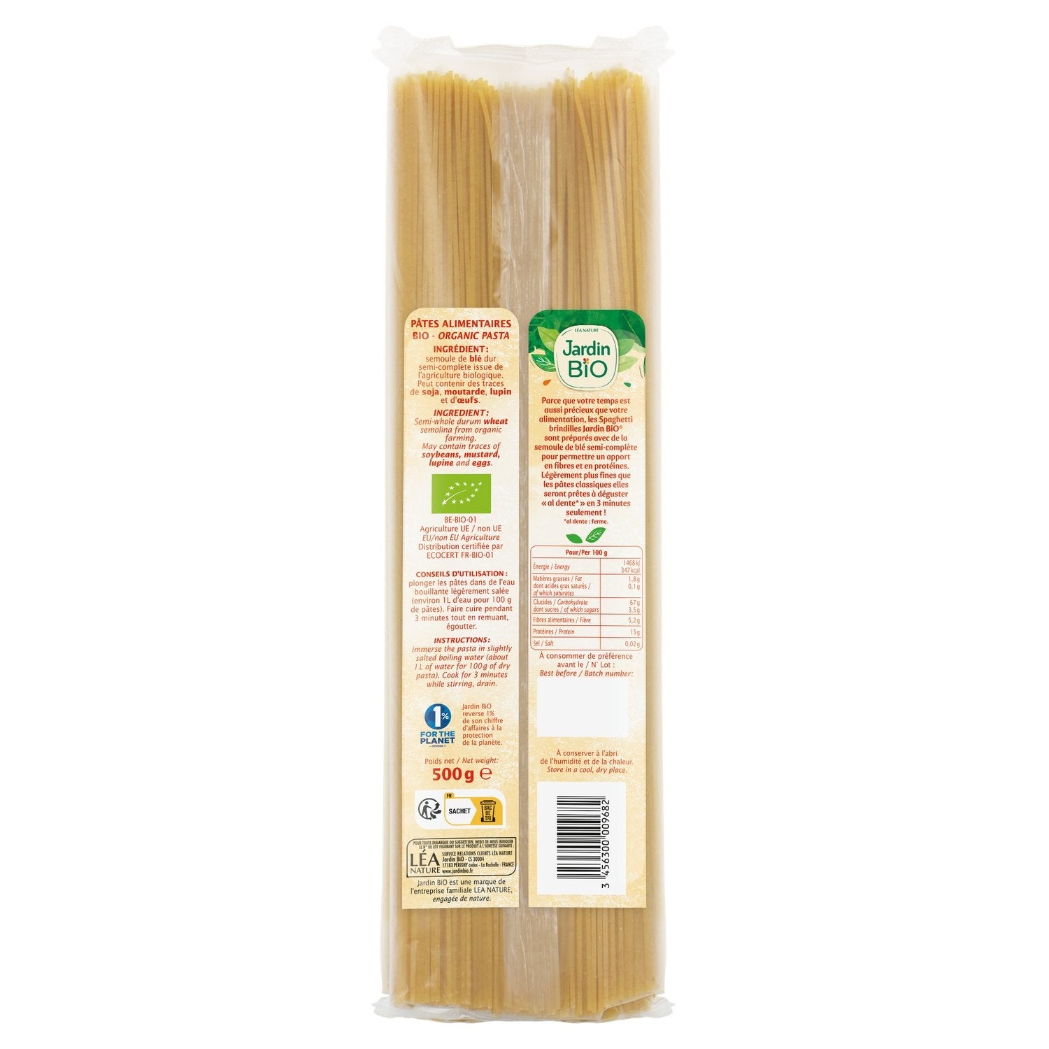 Because your time is as precious as your food, Jardin Bio® spaghetti brindilles are prepared with semi-whole wheat semolina to provide fiber and protein. Slightly thinner than classic pasta, they will be ready to eat 'al-dente' in just 3 minutes! Semi-whole wheat semolina 1% for the planet Organic Source of fiber and protein Express cooking 3 min