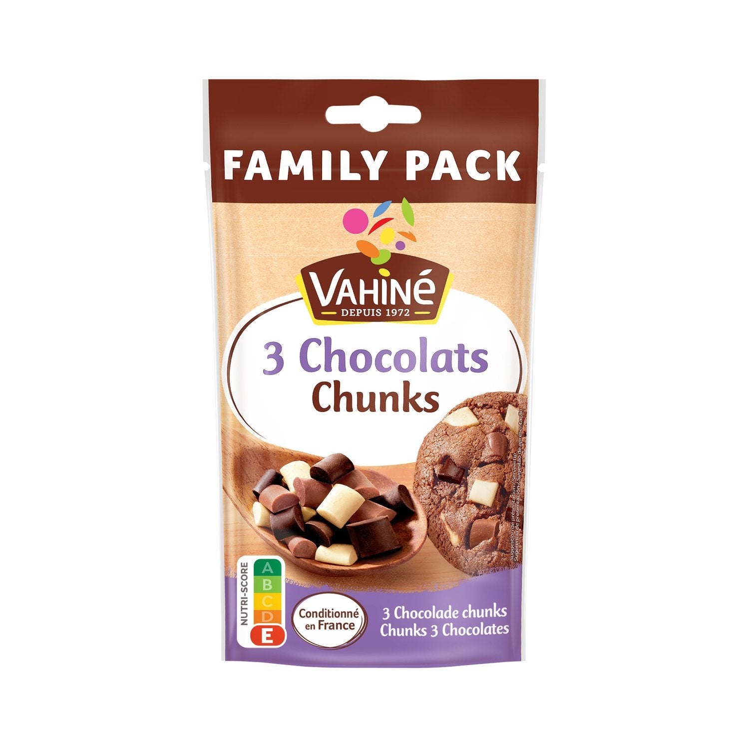 Family-sized 3-chocolate chunks, packaged in France.