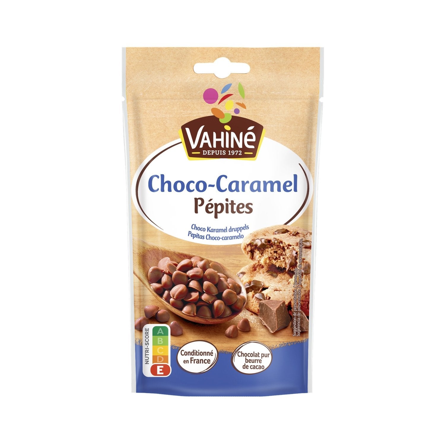 Chocolate-caramel flavored nuggets with pure cocoa butter chocolate, packaged in France.