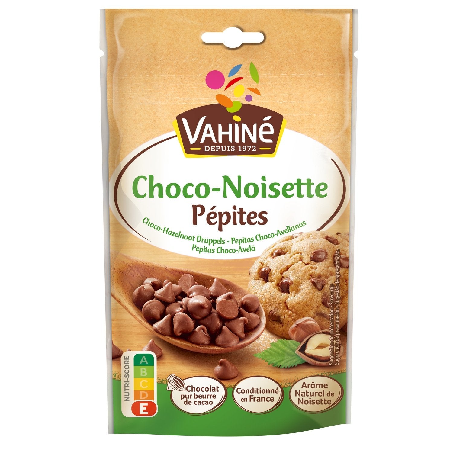 Chocolate-hazelnut chips made from pure cocoa butter chocolate, with a natural hazelnut flavor, packaged in France.