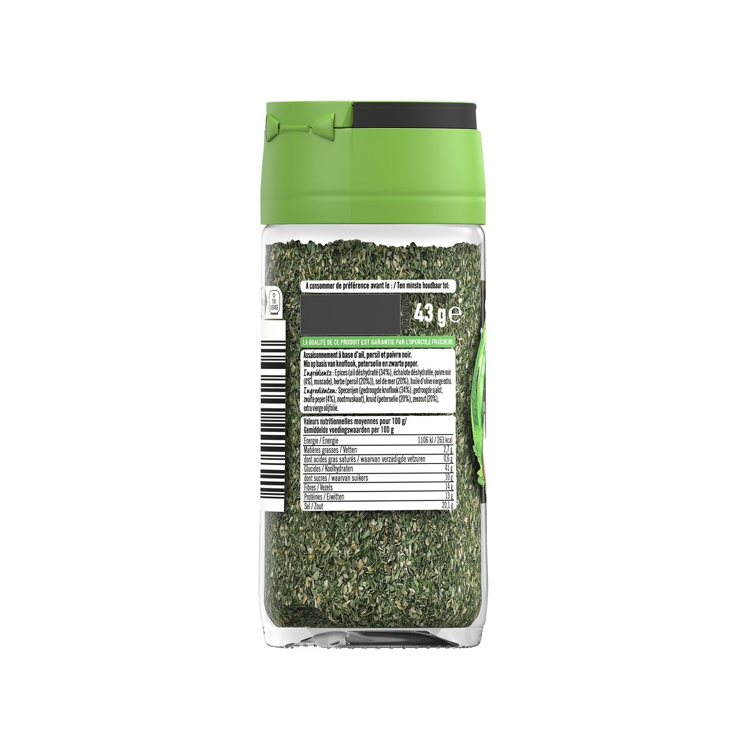 Ingredients: spices (dehydrated garlic (43%), dehydrated shallot, black pepper), parsley (20%), sea salt (20%).
