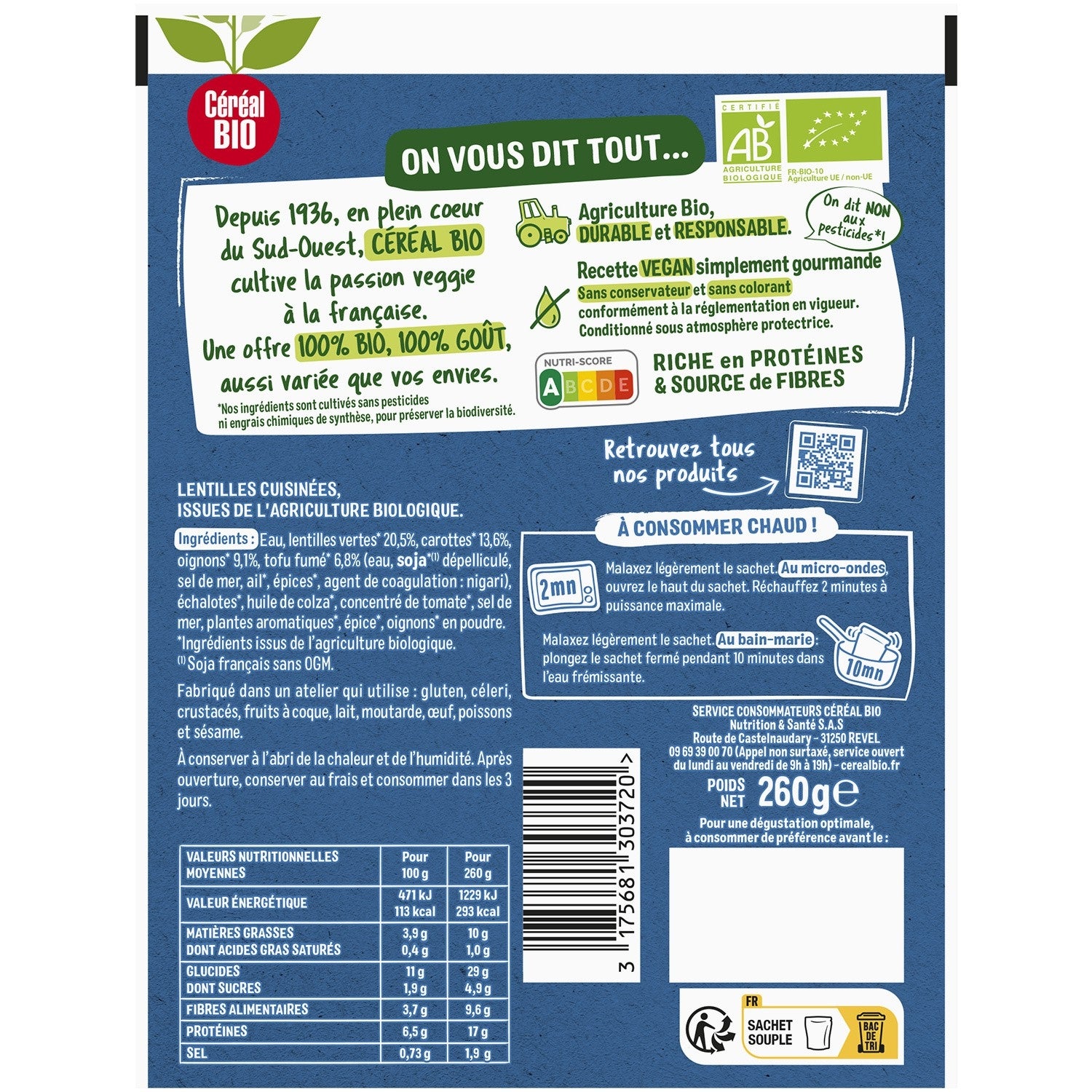 Water, green lentils* 20.5%, carrots* 13.6%, onions* 9.1%, smoked tofu* 6.8% (water, dehulled SOY*(1), sea salt, garlic*, spices*, coagulation agent: nigari), shallots*, rapeseed oil*, tomato paste*, sea salt, aromatic plants*, spices*, onion powder*. * Ingredients from organic farming (1) French GMO-free SOY Made in a factory that uses GLUTEN, CELERY, CRUSTACEANS, NUTS, MILK, MUSTARD, EGG, FISH, SESAME