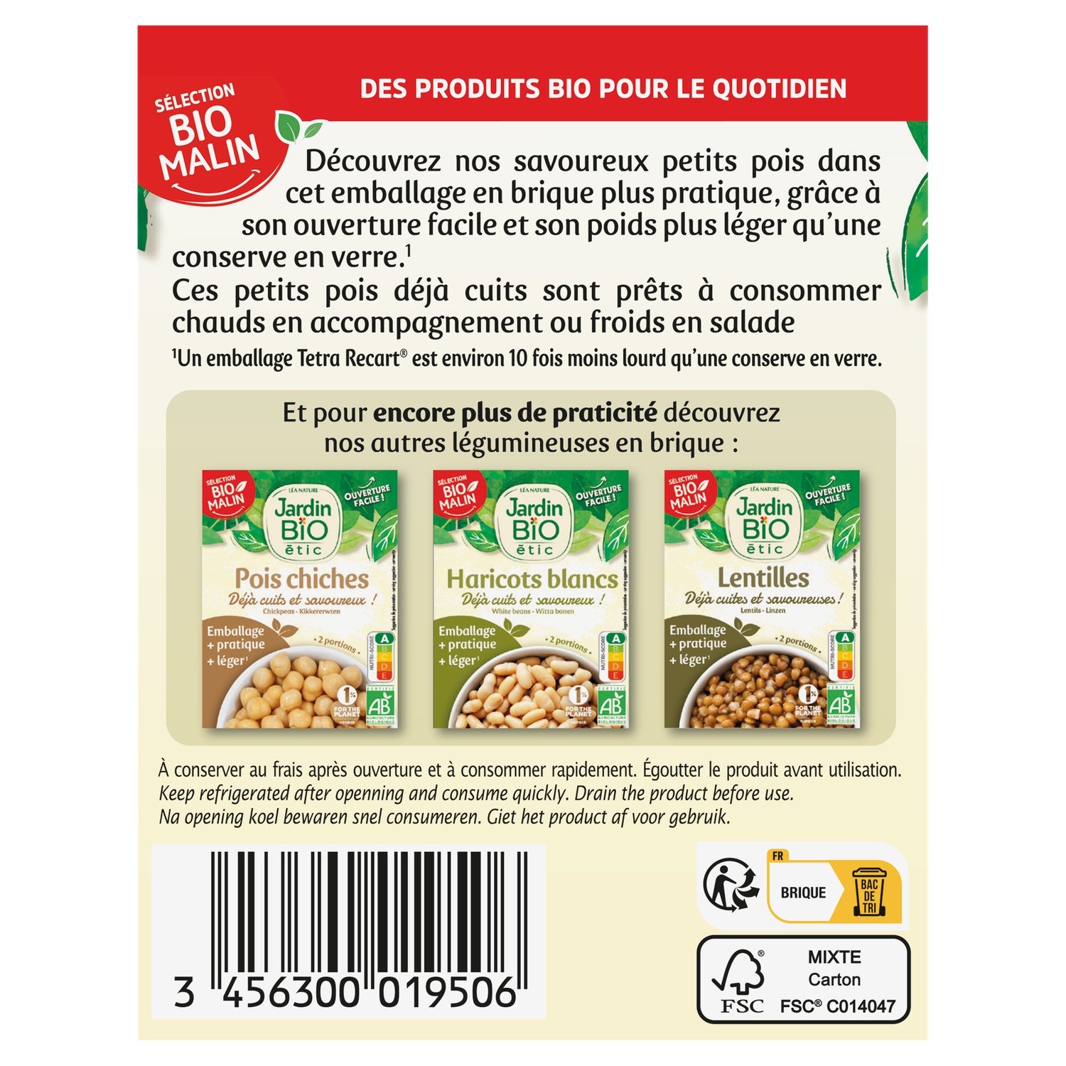DetailsOrganic peas Unit weight: grs EAN barcode: 3456300019506 Brand: JARDIN BIO