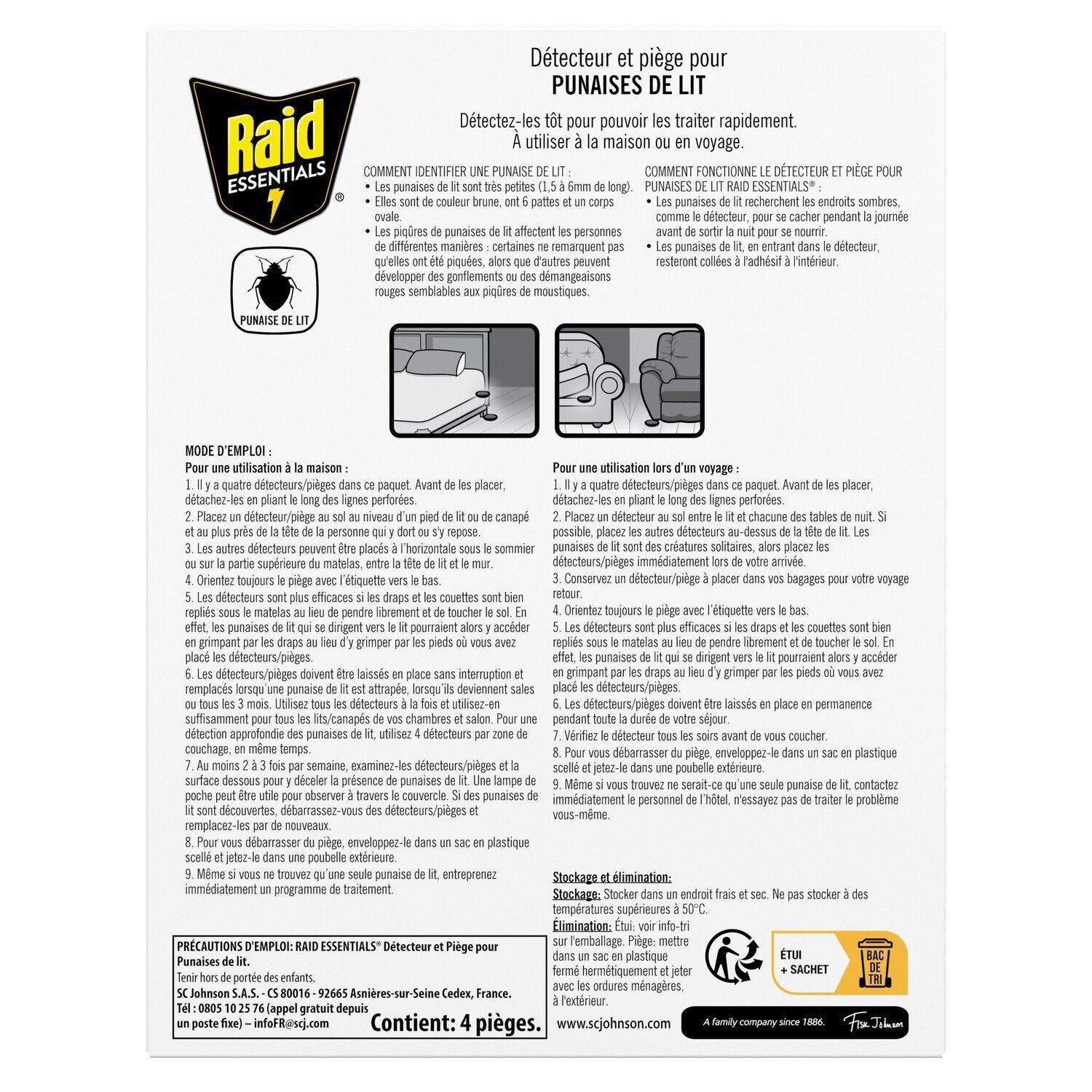 The Raid Essentials® Bed Bug Detector and Trap lets you quickly know if bed bugs are present, so you can treat them quickly without the use of insecticides. To proactively detect them at home or in a hotel, you should place the detectors where bed bugs like to hide: on the floor at the foot of a bed or sofa, under the box spring or on the top of the mattress, between the headboard and the wall. This is because bed bugs seek out dark places, like the detector, to hide during the day before emerging at night to feed. Upon entering the detector, bed bugs will stick to the adhesive inside. To dispose of the trap, wrap it in a sealed plastic bag and dispose of it in an outdoor trash can. Even if you find only one bed bug, begin a treatment program immediately.