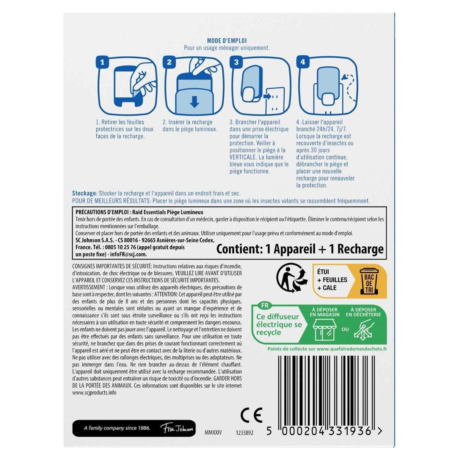 NEW: The Raid Essentials® light trap now protects you against flies thanks to its reinforced adhesive!,PROTECTION AGAINST FLYING INSECTS: The light trap attracts flying insects (moths, fruit flies, midges and flies, ) thanks to its light and traps them thanks to the double-sided adhesive.,INSECTICIDES FREE: Without insecticide, the trap can be used near children, animals and plants, when used according to the instructions.,PROTECTS YOUR HOME: The trap is designed to protect your home: the kitchen, the living room, the bathroom, the garage, ...,INSTRUCTIONS FOR USE: For optimal use, place the light trap as close as possible to the places where you have noticed the presence of flying insects (e.g. in the kitchen next to fruit baskets or near plants, etc.).,Contains: 1 holder + 1 refill