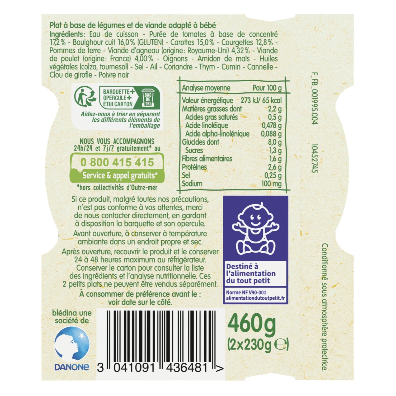 Ingredients: Cooking water - Tomato puree from concentrate 17.2% - Cooked bulgur 16.0% (GLUTEN) - Carrots 15.0% - Courgettes 12.8% - Potatoes - Lamb meat (origin: United Kingdom) 4.32% - Chicken meat (origin: France) 4.00% - Onions - Corn starch - Vegetable oils (rapeseed, sunflower) - Salt - Garlic - Coriander - Thyme - Cumin - Cinnamon - Clove - Black pepper