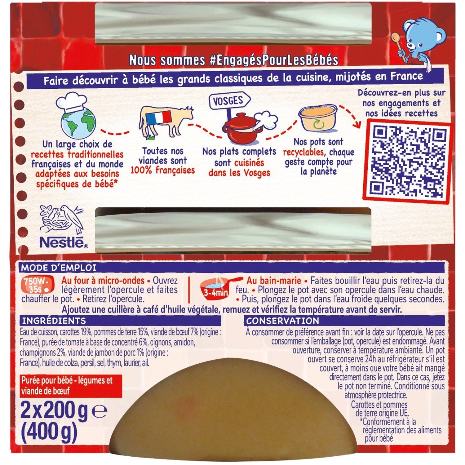 Discover our little baby dish, P'TITE RECETTE Vegetables Beef Bourguignon: a great classic of French cuisine, from Burgundy, suitable for babies from 12 months* with small pieces to continue discovering textures. Vegetables and beef simmered with a bouquet garni (thyme, bay leaf, and parsley) to introduce baby to new flavors. A recipe cooked in France with French beef and pork. Together, let's participate in the ecological transition: we have removed the lids from our jars to reduce plastic per jar by 40%**! Carrots and potatoes from the EU