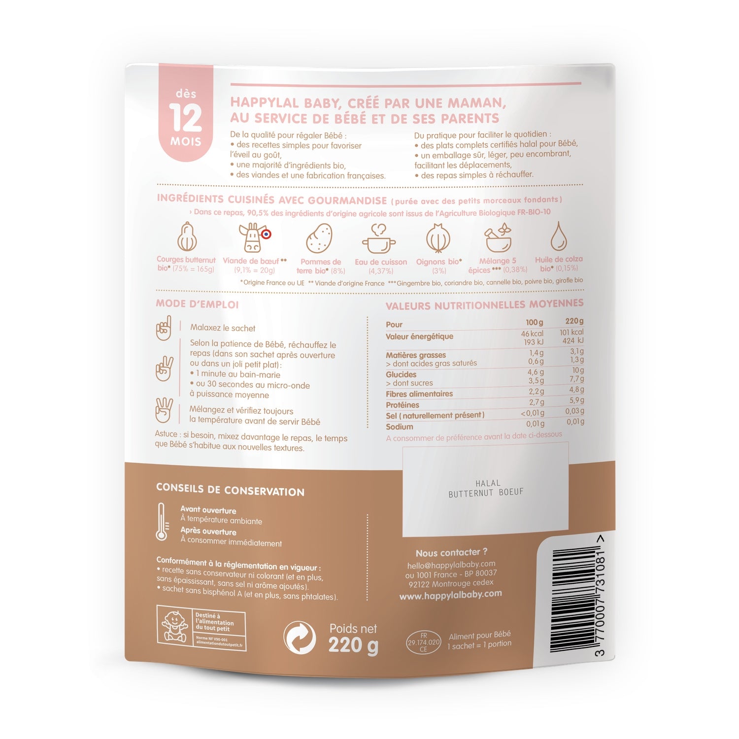 Happylal Baby is the first French halal-certified baby food, with 3 fundamentals: - good for the child: simple recipes to encourage taste development; 90% organic, French meats and manufacturing - practical for parents: a new range of infant food to simplify everyday life; meals that are easy to heat in the microwave or in a bain-marie; safe, lightweight, space-saving sachet packaging, ideal for traveling; storage at room temperature - reliable traceability and certification: a certification process entrusted to AVS for control at all stages of product manufacturing (from procurement to packaging)
