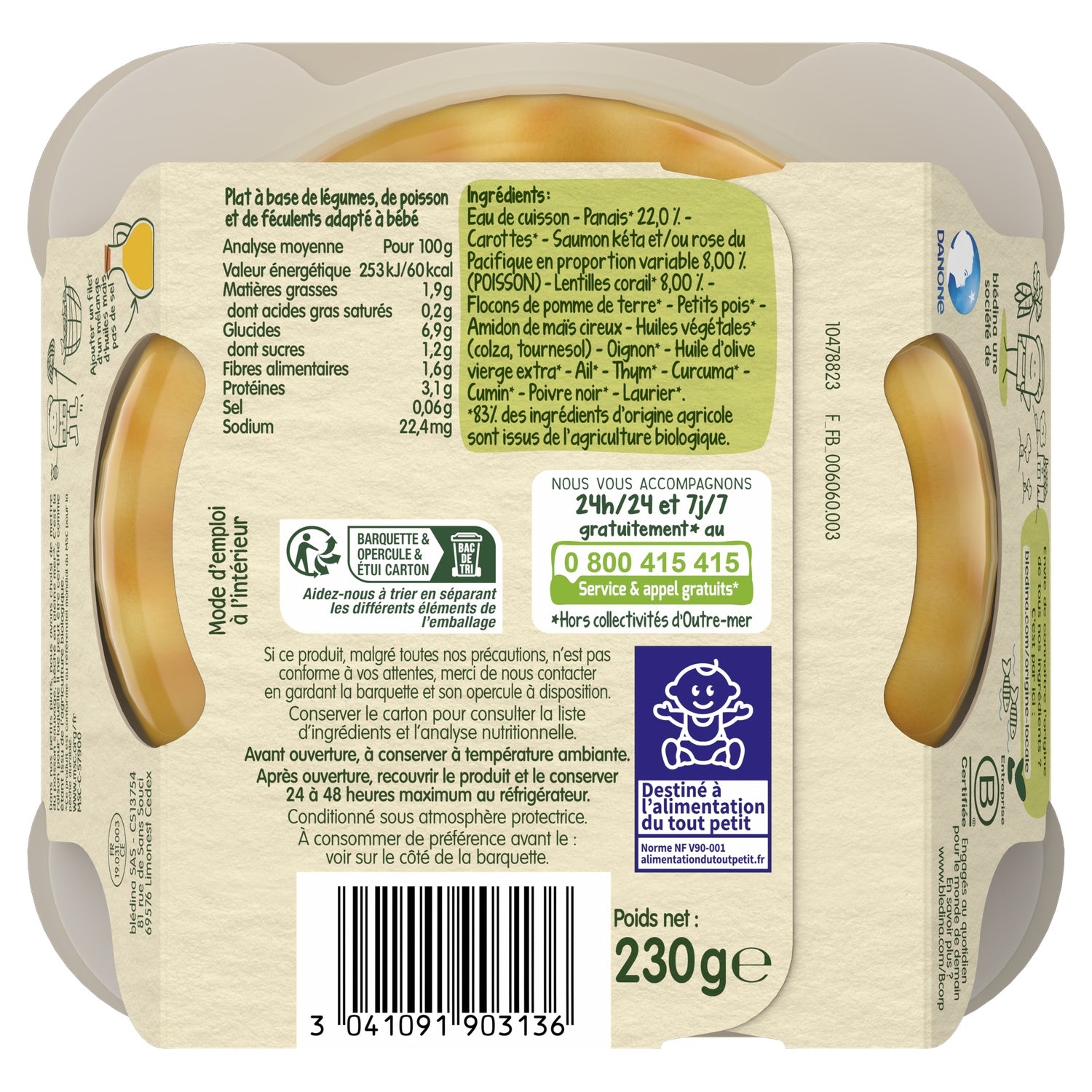 Ingredients: Cooking water - Parsnips* 22.0% - Carrots* - Chum salmon and/or Pacific pink salmon in varying proportions 8.00% (FISH) - Coral lentils* 8.00% - Potato flakes* - Peas* - Waxy maize starch - Vegetable oils* (rapeseed, sunflower) - Onion* - Extra virgin olive oil* - Garlic* - Thyme* - Turmeric* - Cumin* - Black pepper* - Bay leaf*. *83% of the ingredients of agricultural origin are from organic farming