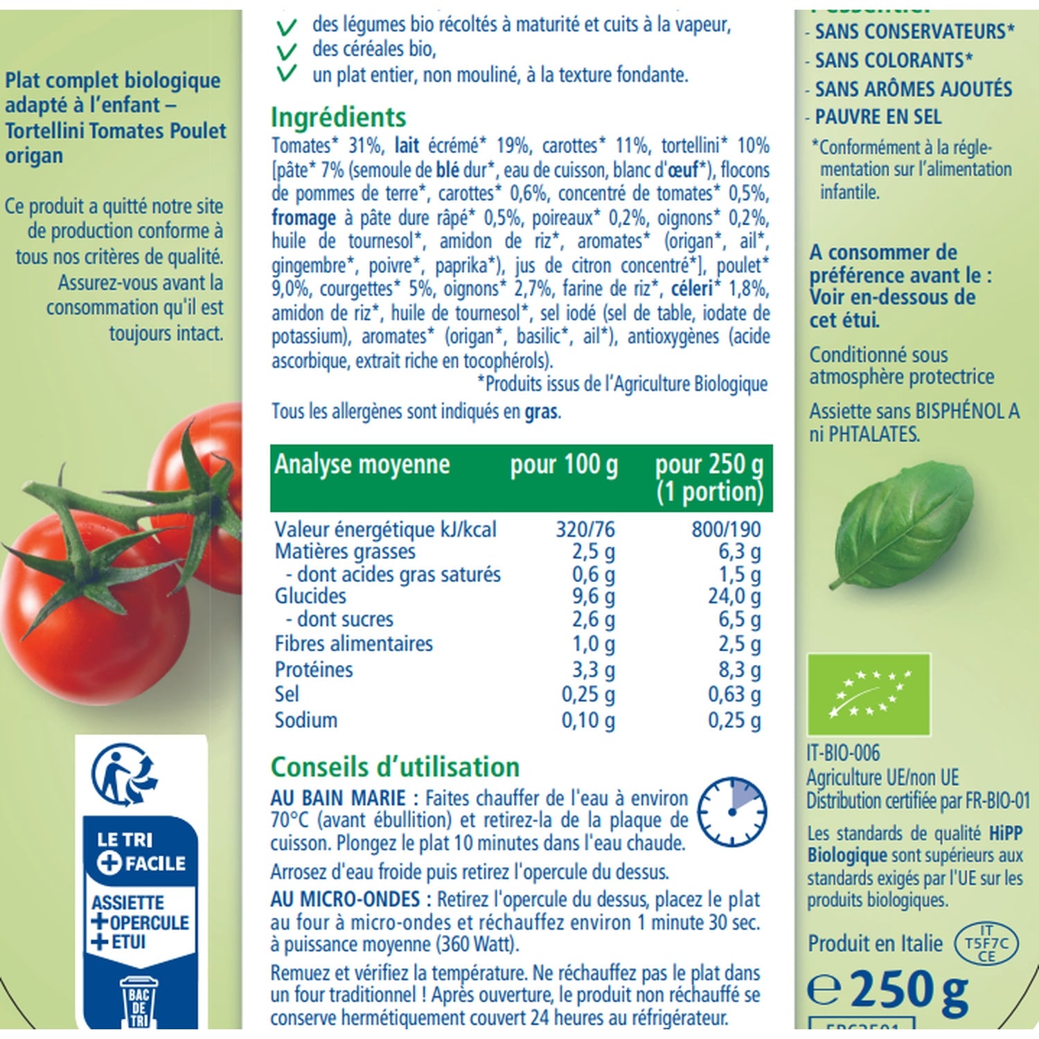 Ingredients: Tomatoes* 35%, skimmed MILK* 19%, carrots* 11%, tortellini* 10%, pasta dough* 7% (durum WHEAT semolina*, water, EGG white*), potato flakes*, carrots* 0.6%, tomato paste* 0.5%, grated hard CHEESE* 0.5%, leek* 0.2%, onions* 0.2%, sunflower oil*, rice starch*, spices* (oregano*, garlic*, ginger*, pepper*, paprika*), concentrated lemon juice*, chicken* 9.0%, zucchini* 5%, onions* 2.7%, rice flour*, CELERIAC* 1.8%, rice starch*, sunflower oil*, iodized table salt (table salt, potassium iodate), spices* (oregano*, basil*, garlic*), antioxidants (acid ascorbic, tocopherol-rich extract). *Products from Organic Farming All allergens are indicated in CAPITALS.