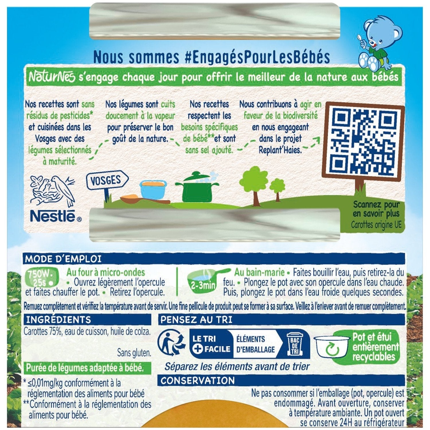 NaturNes® helps take care of nature to offer the best to baby. Our vegetables are grown in open fields and selected at maturity, respecting nature's rhythm, then gently steamed to best preserve the flavors. So, for baby's food diversification, introduce them to our baby food jars with carrots, made in France in the Vosges! Between 4 and 6 months, ask your doctor for advice on how to get started with diversification.