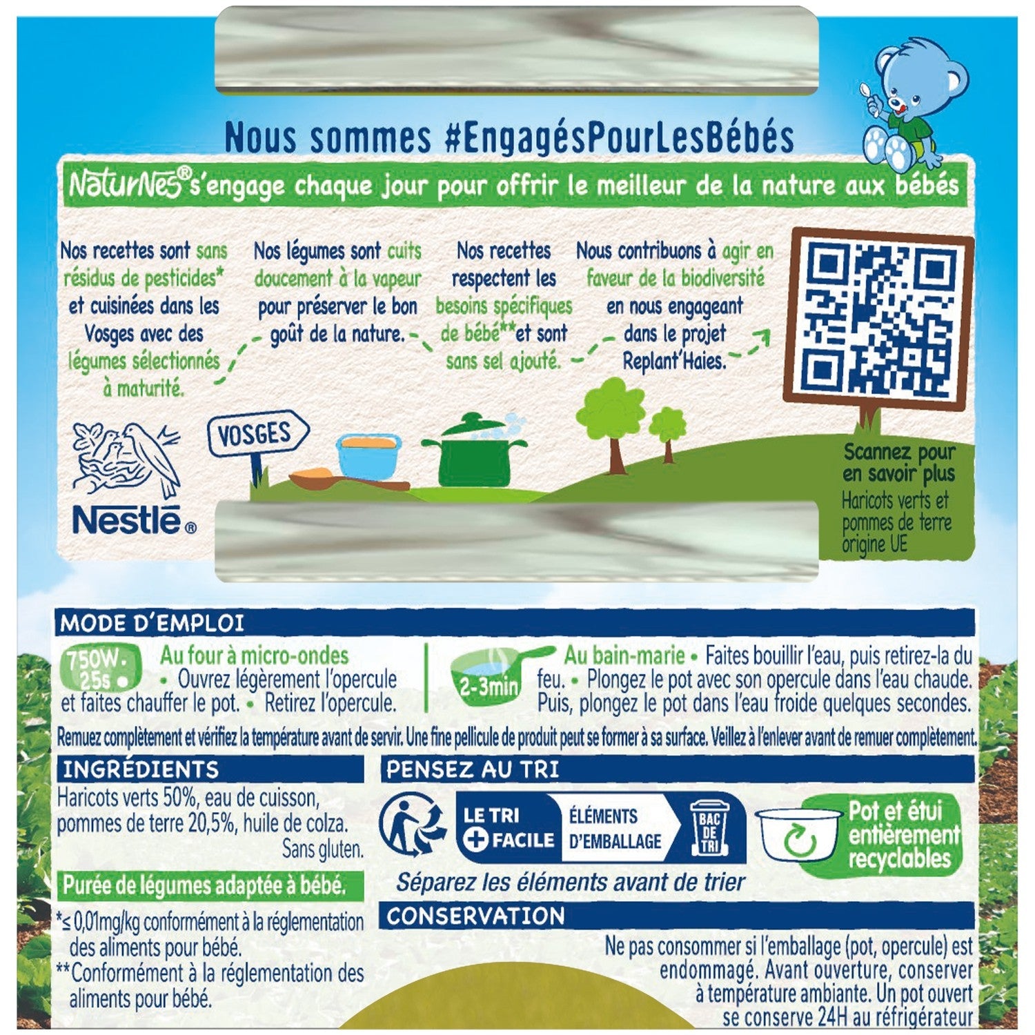 Vegetables selected at maturity and for their taste, Gentle steam cooking to preserve flavors, Produced in France in the Vosges. French green beans, No pesticide residues (< 0.01 mg/kg)¹ Ingredients 100% of natural origin No preservatives¹ No coloring¹ ¹ In accordance with the rules of infant feeding., A smooth texture suitable for first spoonfuls, Vegetable puree suitable for babies
