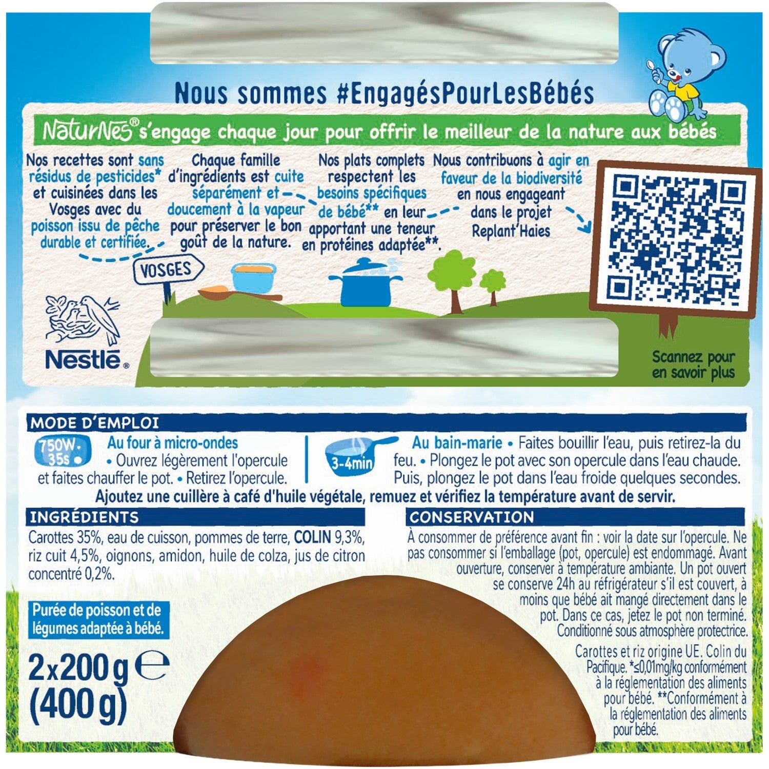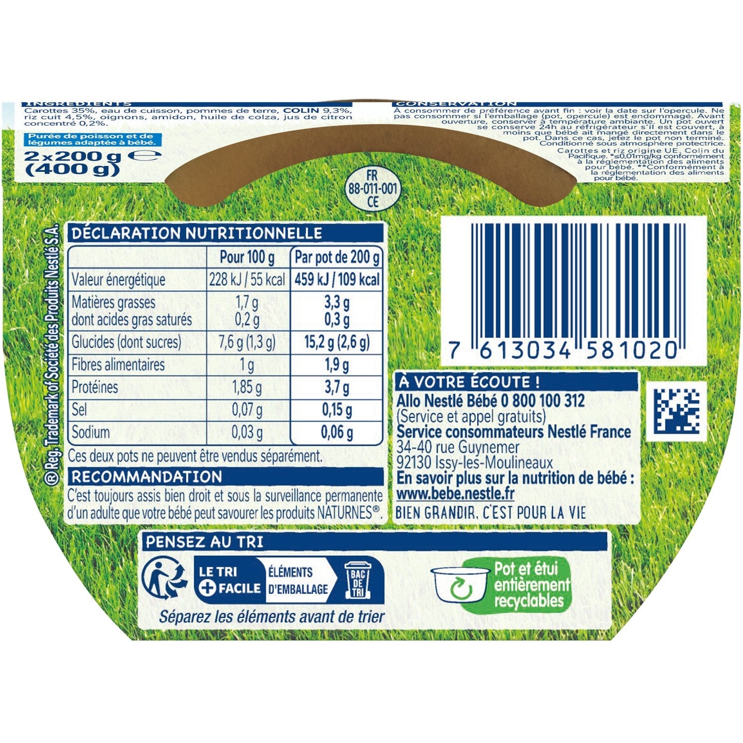 Wild and sustainably sourced fish.,Each family of ingredients is gently steamed separately to preserve the good taste of nature.,Produced in France in the Vosges. Carrots and rice from the EU, Pacific pollock.,No pesticide residues (< 0.01 mg/kg)¹ 100% natural ingredients ¹In accordance with infant nutrition regulations.,No added salt, no preservatives¹, no coloring¹. ¹In accordance with baby food regulations.,A ground texture adapted to your baby's age¹ ¹In accordance with baby food regulations.
