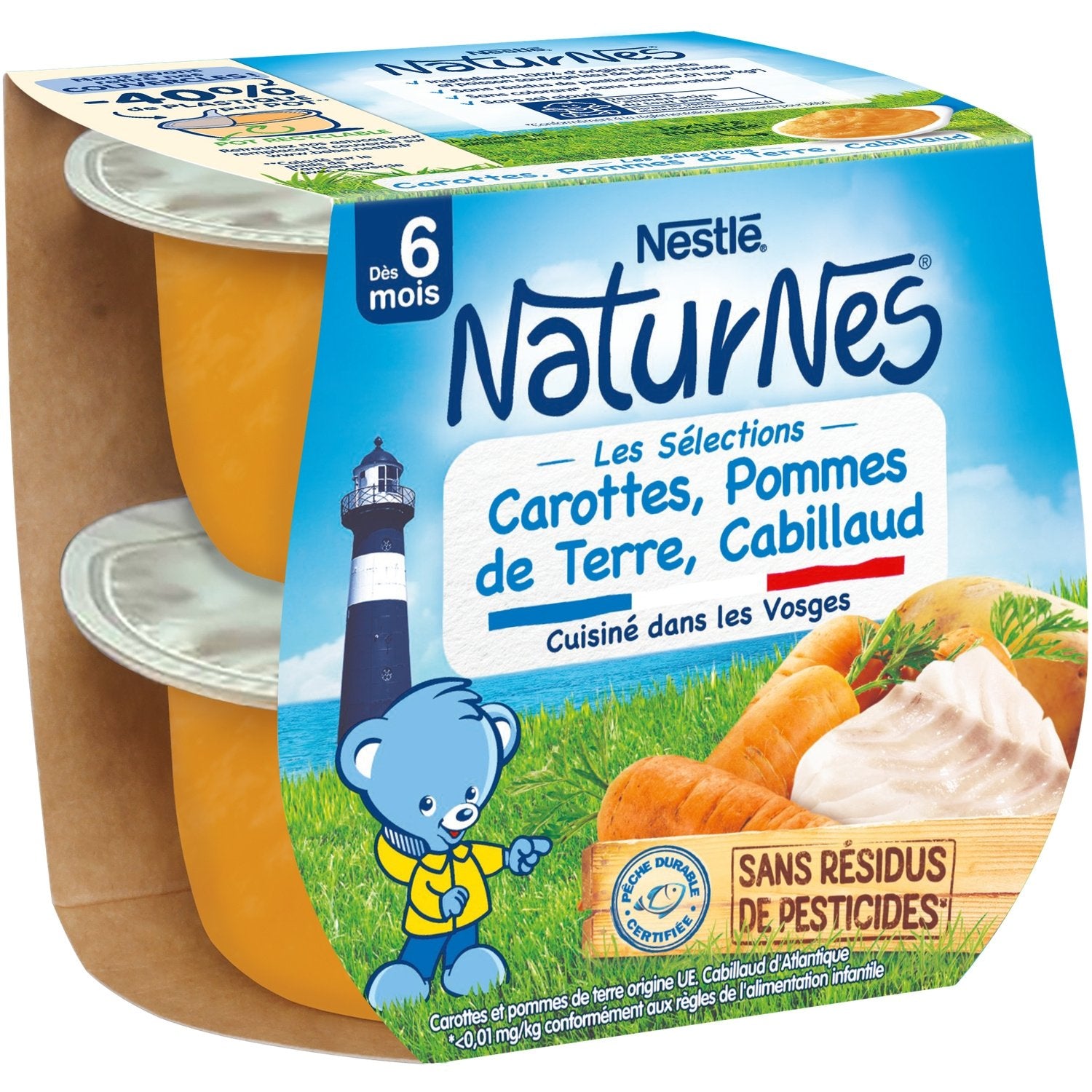 Wild and sustainably sourced fish,Each family of ingredients is cooked separately with gentle steam to preserve the good taste of nature.,Produced in France in the Vosges. Carrots and potatoes from the EU, Atlantic cod.,No pesticide residues (< 0.01 mg/kg)¹ Ingredients 100% of natural origin ¹In accordance with the rules for infant nutrition.,No added salt, no preservatives¹, no coloring¹. ¹In accordance with baby food regulations.,A ground texture adapted to your baby's age¹ ¹In accordance with baby food regulations.
