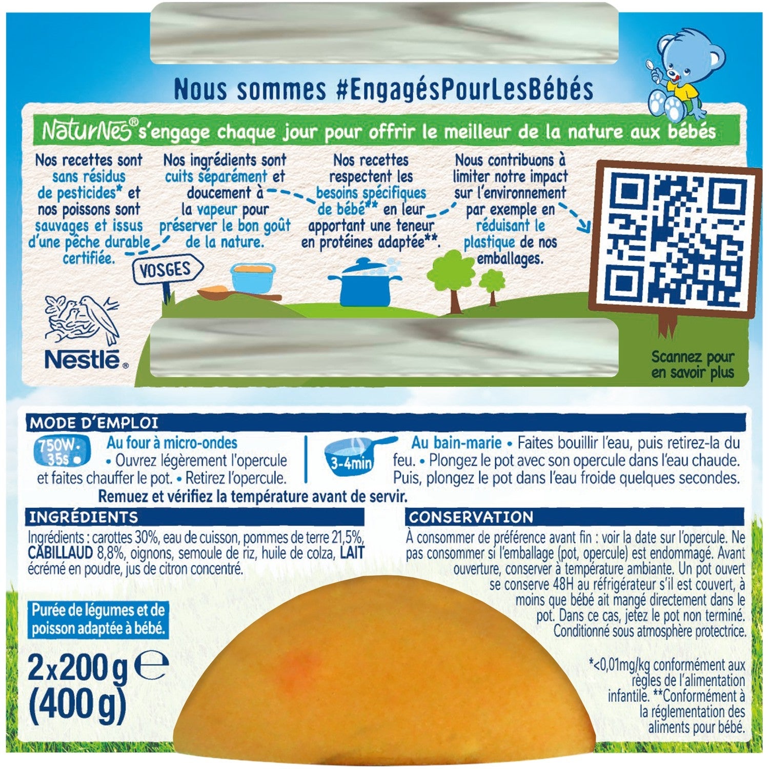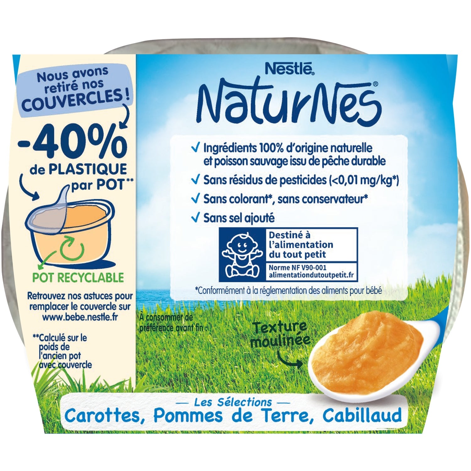 NaturNes® helps take care of nature to offer the best to baby. In its "Les Sélections" range, NaturNes® carefully chooses the origin of its meats and fish: 100% of the meats are of French origin and 100% of the fish are wild. So, for baby's dietary diversification, introduce them to our baby food jars with vegetables and cod, made in France in the Vosges, with 100% natural ingredients!