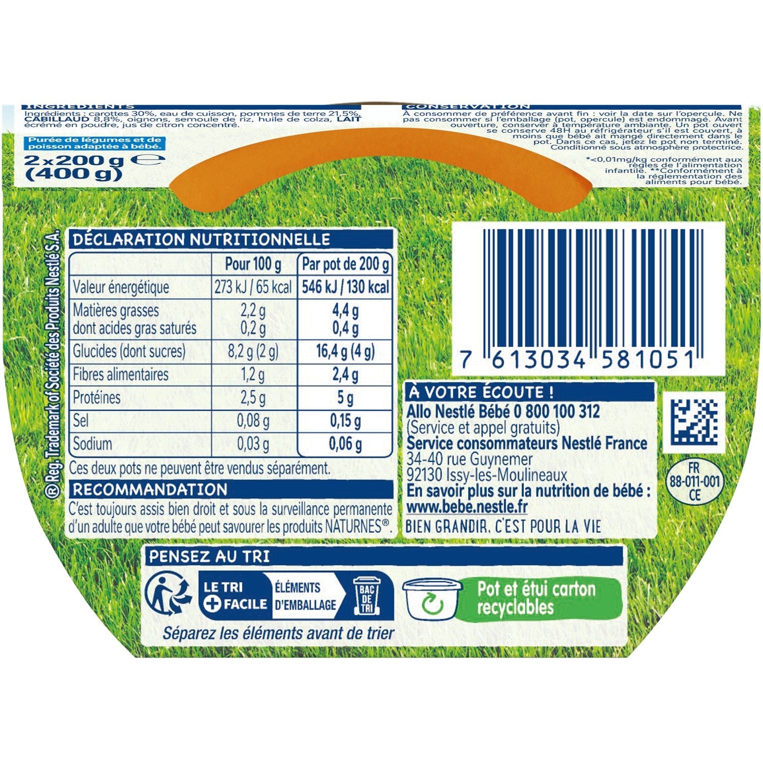 Ingredients: Carrots 30%, cooking water, potatoes 21.5%, COD 8.8%, onions, rice semolina, rapeseed oil, skimmed MILK powder, concentrated lemon juice.