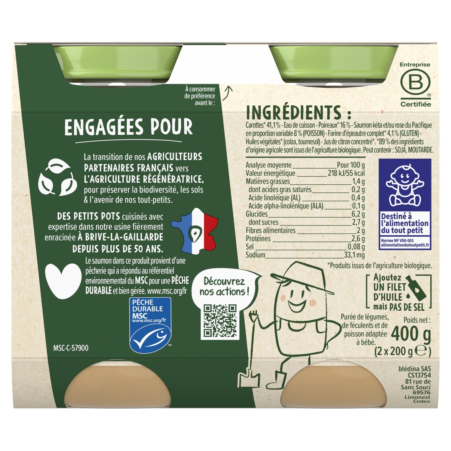 No added salt. No preservatives, in accordance with baby food regulations. Cooked in France in Brive-la-Gaillarde with French carrots! In our dishes, we have chosen to use wild fish caught in the open sea (in accordance with the MSC global standard for sustainable fishing). We continue to rigorously select the organic ingredients in our recipes.