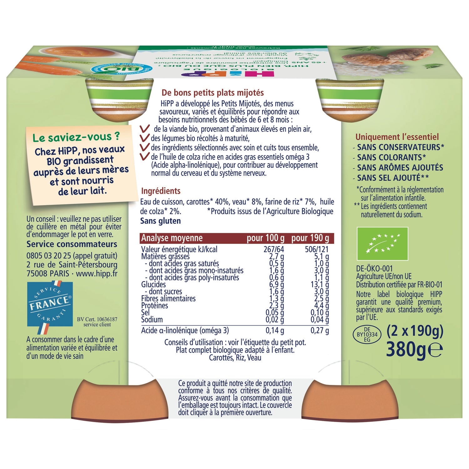 Delicious little simmered dishes HiPP has developed Petits Mijotés, tasty, varied and balanced menus to meet the nutritional needs of babies aged 6 and 8 months: ✔ organic meat, from animals raised outdoors, ✔ organic vegetables harvested when ripe, ✔ ingredients carefully selected and cooked all together, ✔ rapeseed oil rich in essential omega 3 fatty acids (Alpha-linolenic acid), to contribute to the normal development of the brain and nervous system.