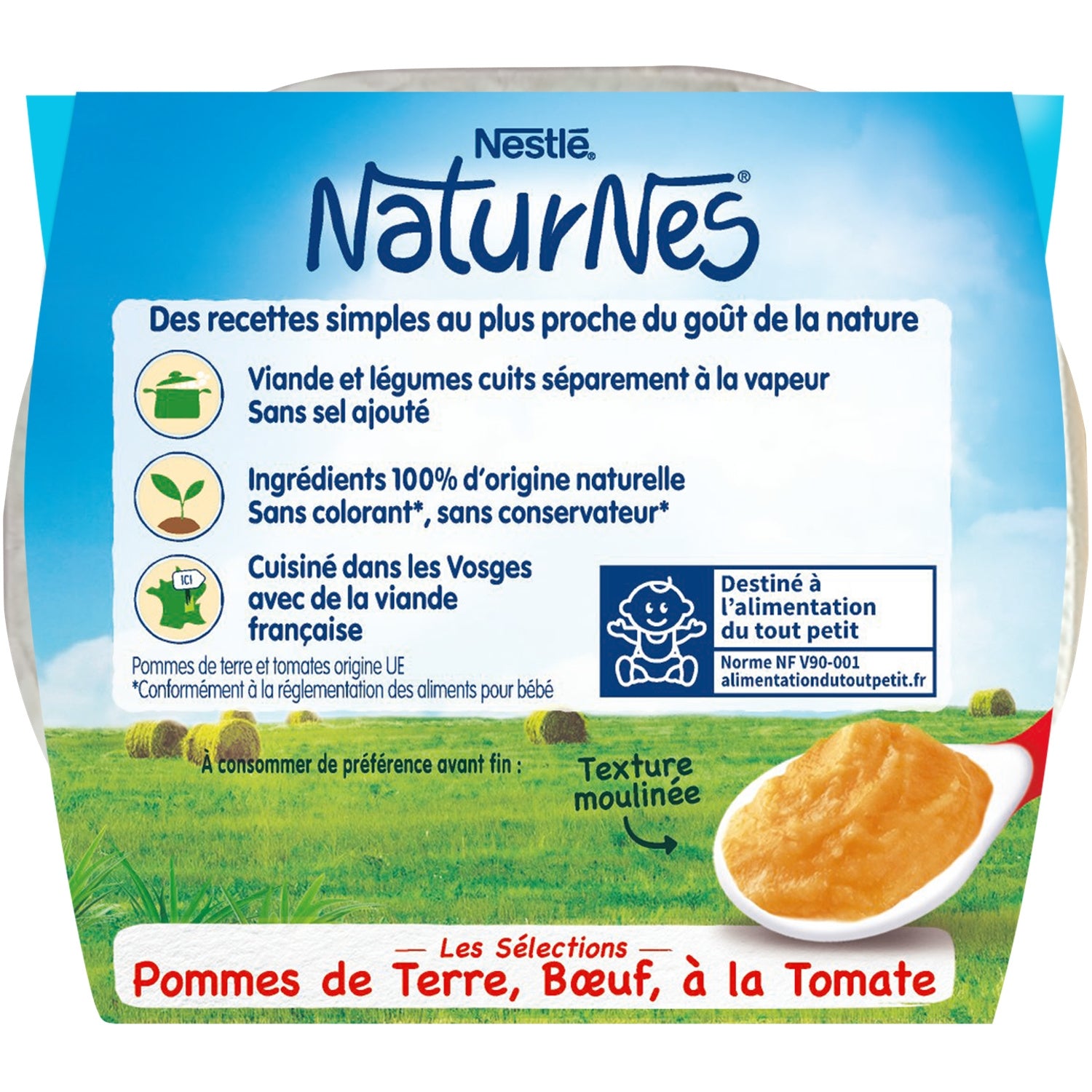 NaturNes® helps take care of nature to offer the best to baby. In its "Les Sélections" range, NaturNes® carefully chooses the origin of its meats and fish: 100% of the meats are of French origin and 100% of the fish are wild. So, for baby's dietary diversification, introduce them to our baby food jars with potatoes and beef with tomato, made in France in the Vosges, with 100% natural ingredients!