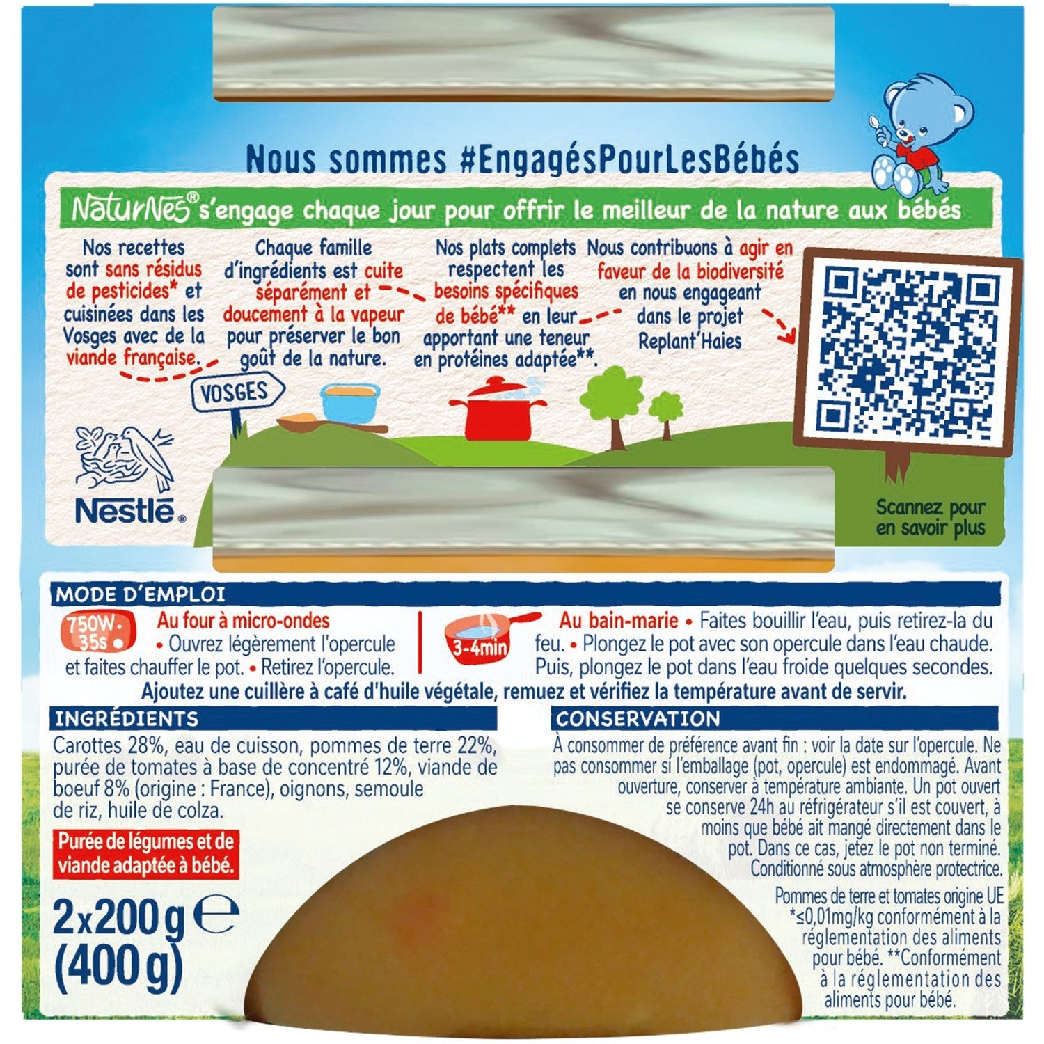 100% French beef,Each family of ingredients is cooked separately with gentle steam to preserve the good taste of nature.,Produced in France in the Vosges. Potatoes and tomatoes of EU origin.,No pesticide residues (< 0.01 mg/kg)¹ Ingredients 100% of natural origin ¹In accordance with the rules of infant nutrition.,No added salt, no preservatives¹, no coloring¹. ¹In accordance with the regulations for baby food.,A ground texture adapted to the age of your baby¹ ¹In accordance with the regulations for baby food.