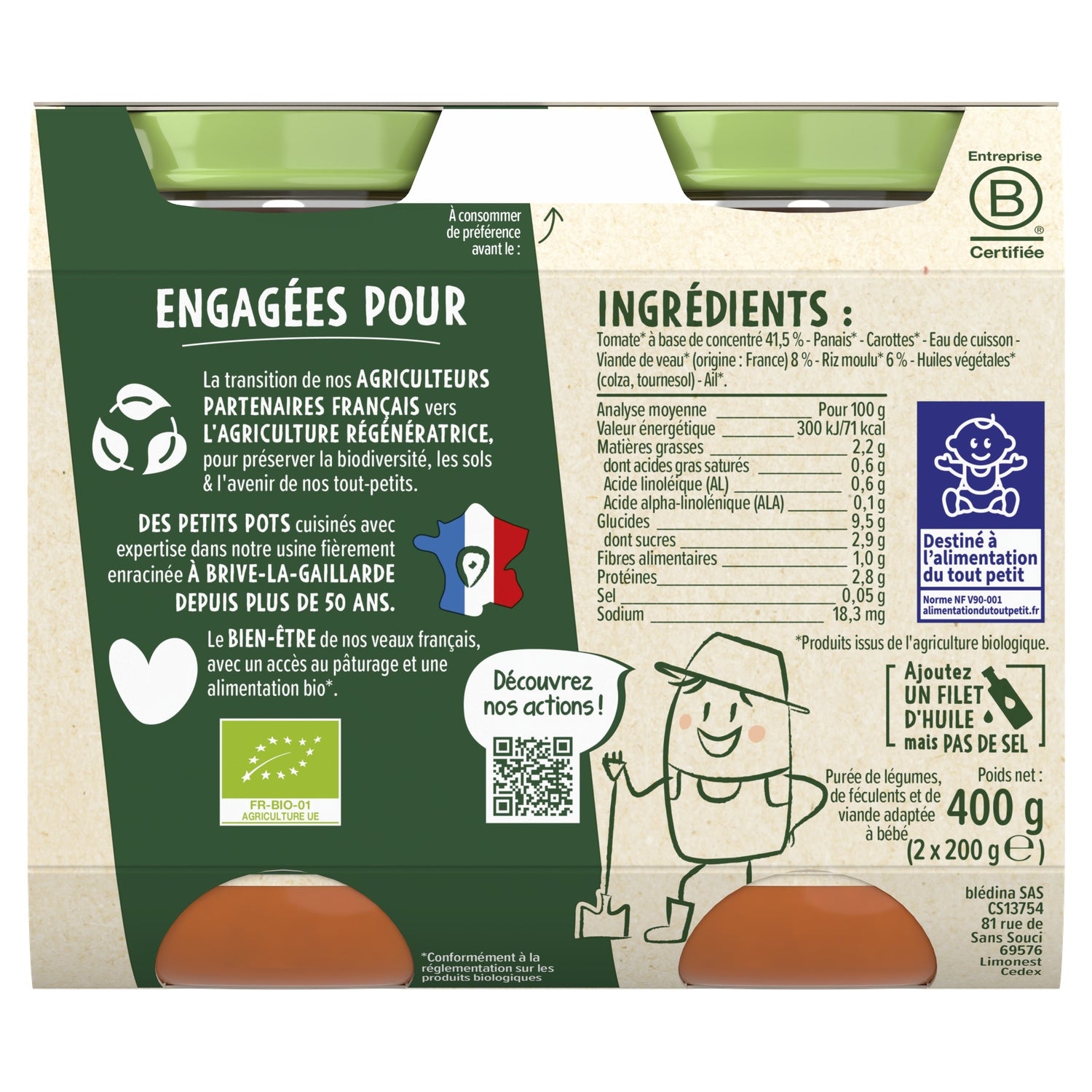 No added salt. No preservatives, in accordance with baby food regulations.,Cooked in France in Brive-la-Gaillarde with French veal!,Committed to animal welfare.