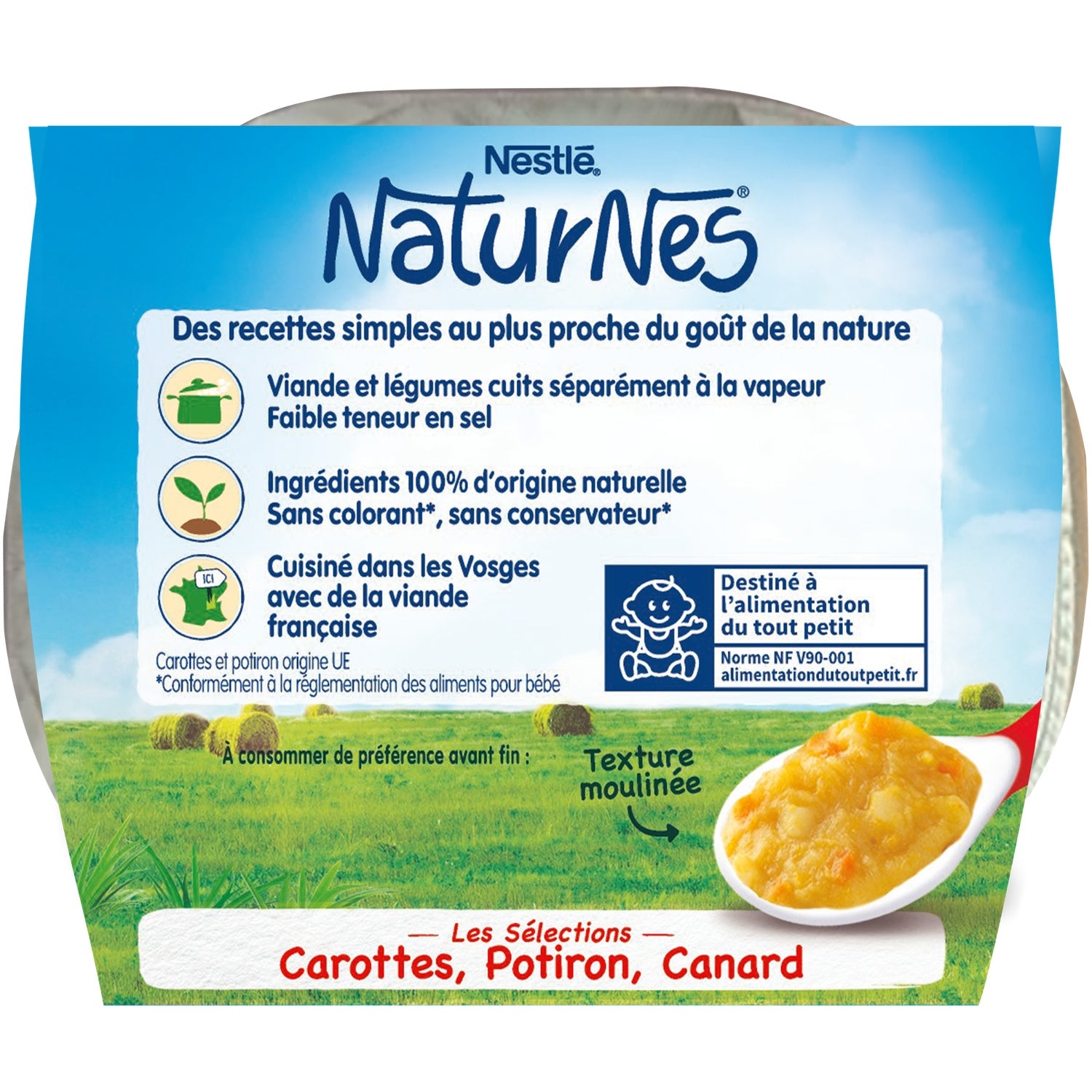 NaturNes® helps take care of nature to offer the best to baby. In its "Les Sélections" range, NaturNes® carefully chooses the origin of its meats and fish: 100% of the meats are of French origin and 100% of the fish are wild. So, for baby's dietary diversification, introduce them to our baby food jars with vegetables and duck, made in France in the Vosges, with 100% natural ingredients!