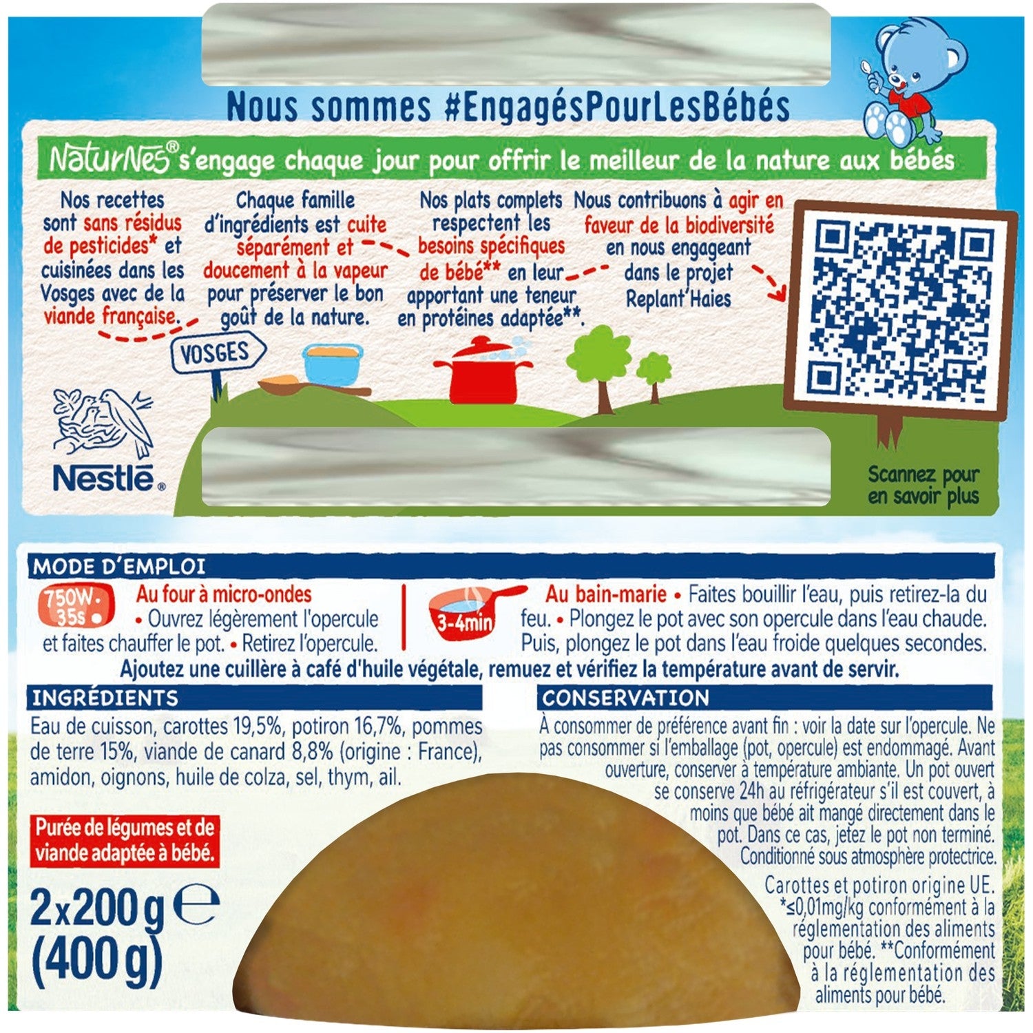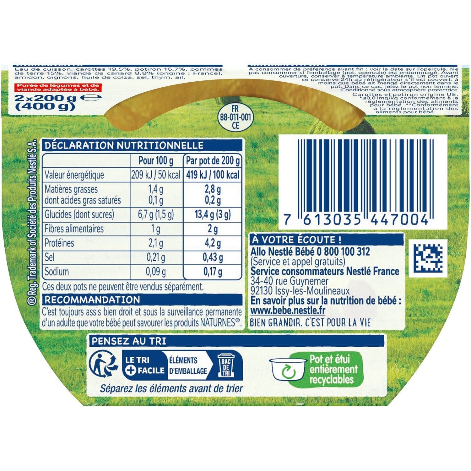 100% French duck,Each family of ingredients is cooked separately with gentle steam to preserve the good taste of nature.,Produced in France in the Vosges. Carrots and pumpkin of EU origin.,No pesticide residues (< 0.01 mg/kg)¹ Ingredients 100% of natural origin. ¹Complies with infant nutrition regulations.,Low in salt, no preservatives¹, no coloring¹ ¹Complies with baby food regulations.,Small pieces adapted to your baby's age¹ ¹Complies with baby food regulations.