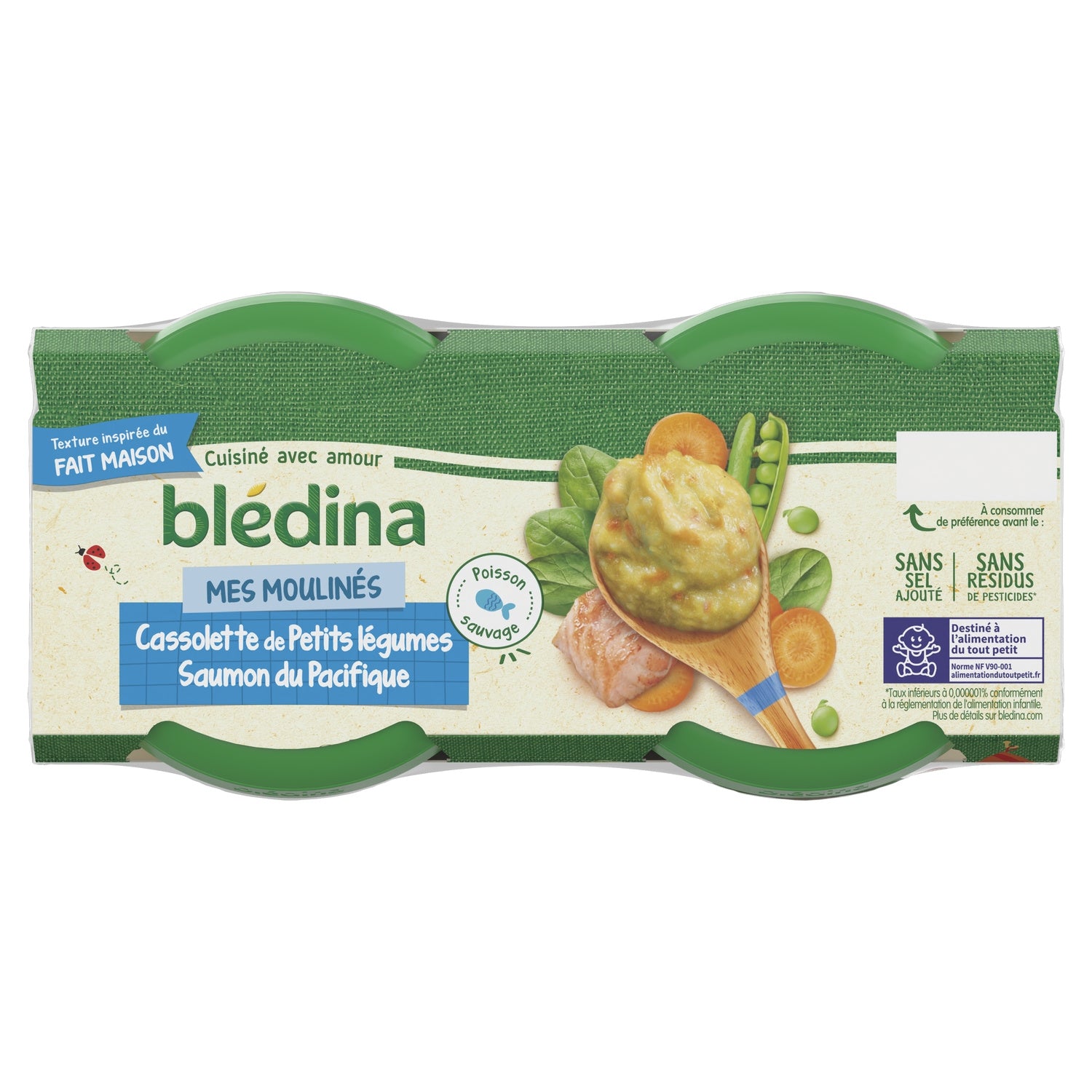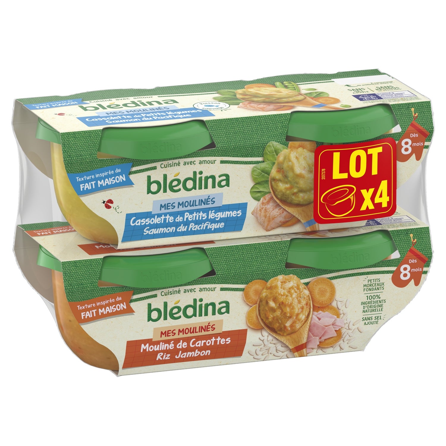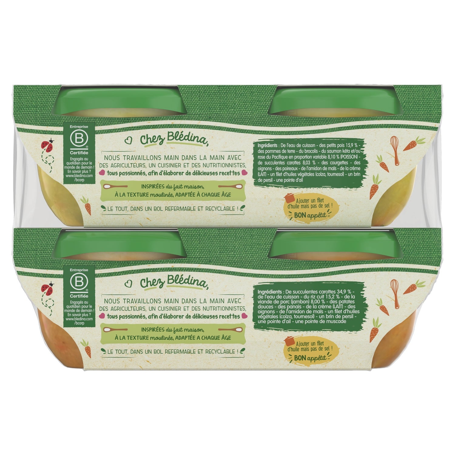 BLEDINA MY MOULINÉS. 2 Baby Vegetables with Pacific Salmon / 2 Carrot Rice and Ham Puree - from 8 months. Discover My Puree, delicious recipes inspired by homemade recipes with textures adapted to each baby's age. All in a practical and recyclable bowl.