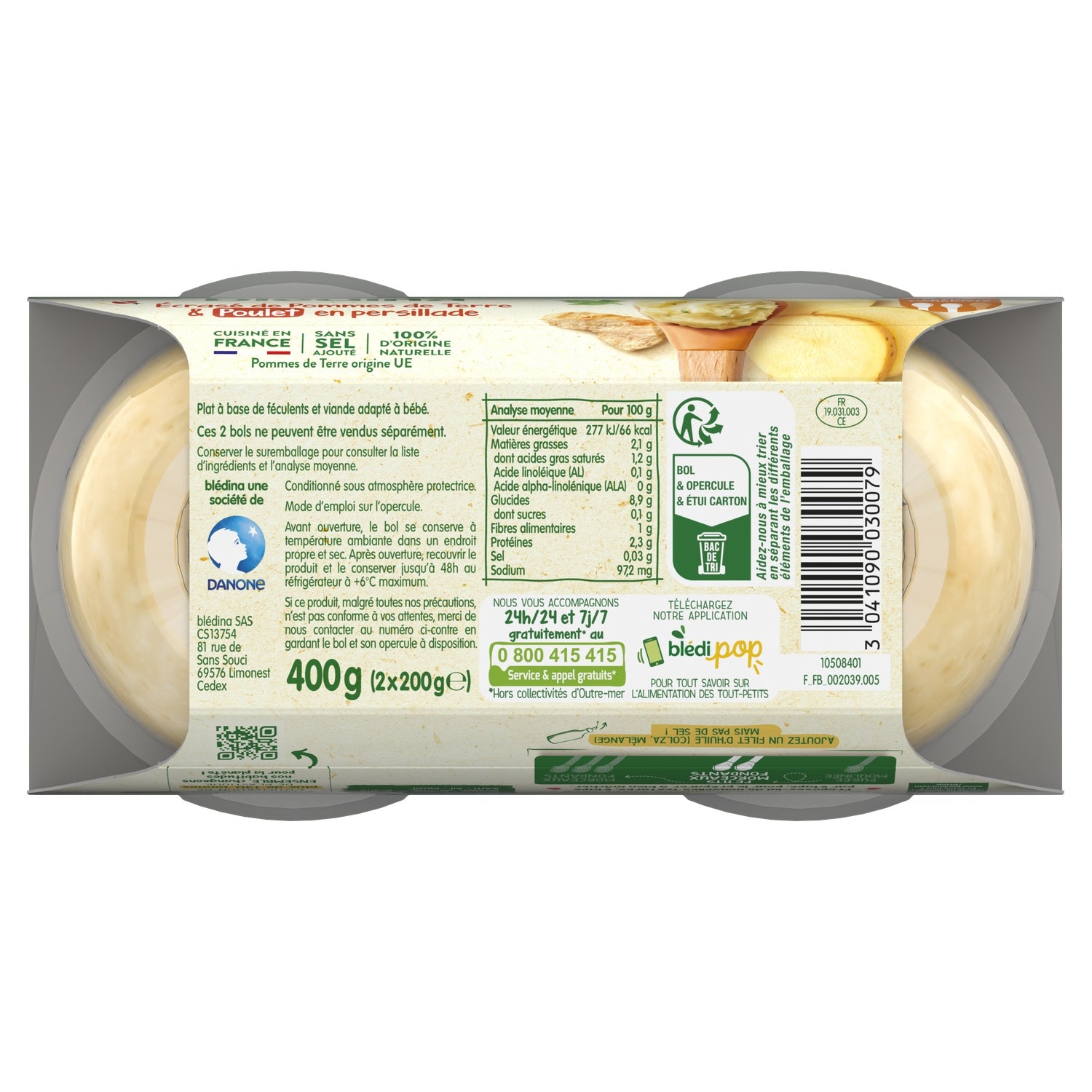 Ingredients: Potatoes 44.4% - Cooking water - Chicken meat (origin: France) 8.16% - Corn starch - Butter (MILK) - Garlic - Parsley.
