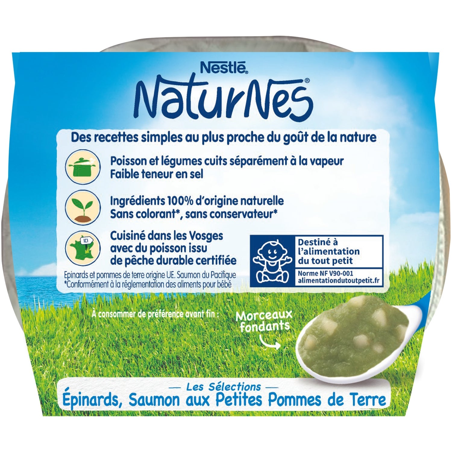 NaturNes® helps take care of nature to offer the best to baby. In its "Les Sélections" range, NaturNes® carefully chooses the origin of its meat and fish: 100% of the meat is of French origin and 100% of the fish is wild. So, for baby's dietary diversification, introduce them to our baby food jars with spinach and salmon, made in France in the Vosges, with 100% natural ingredients!