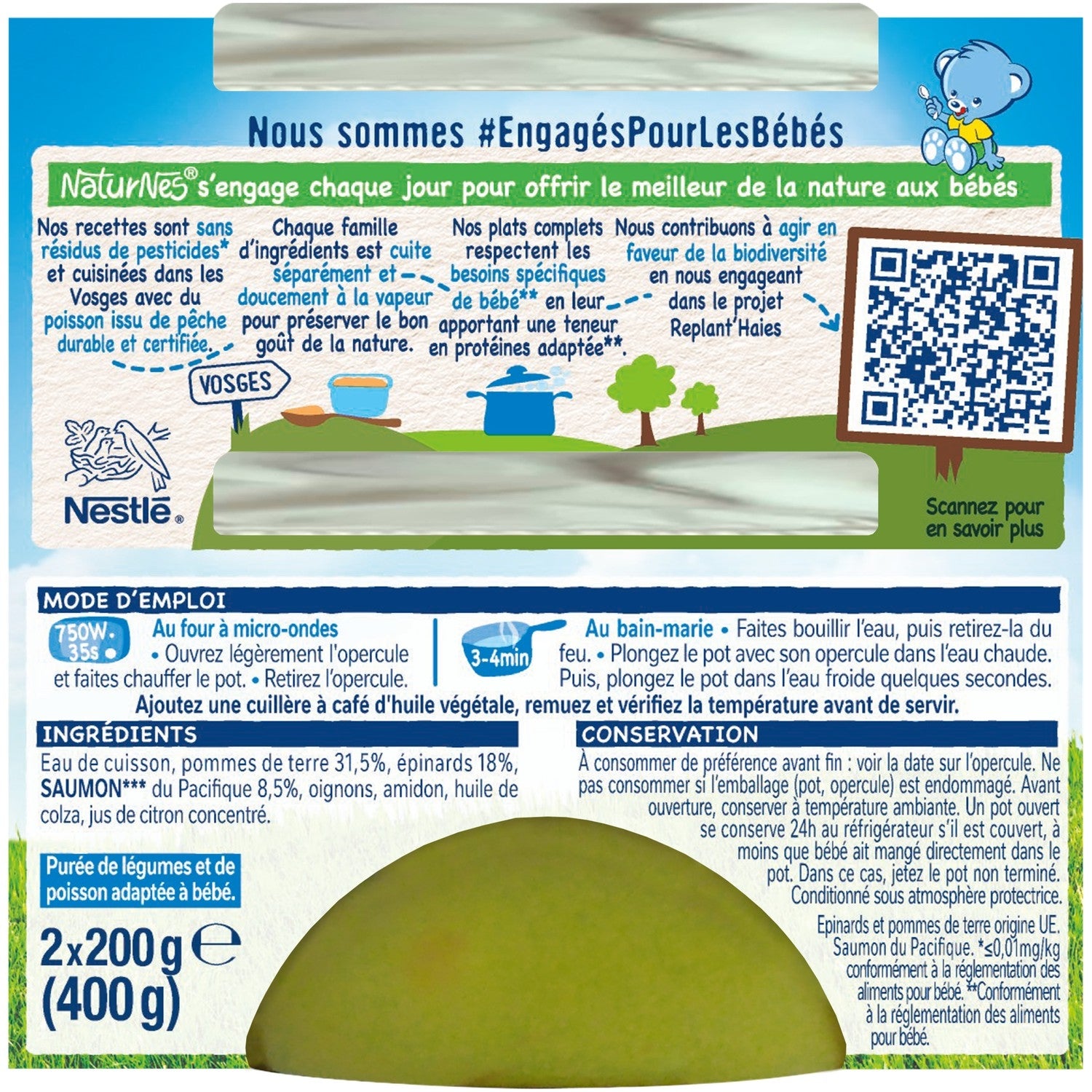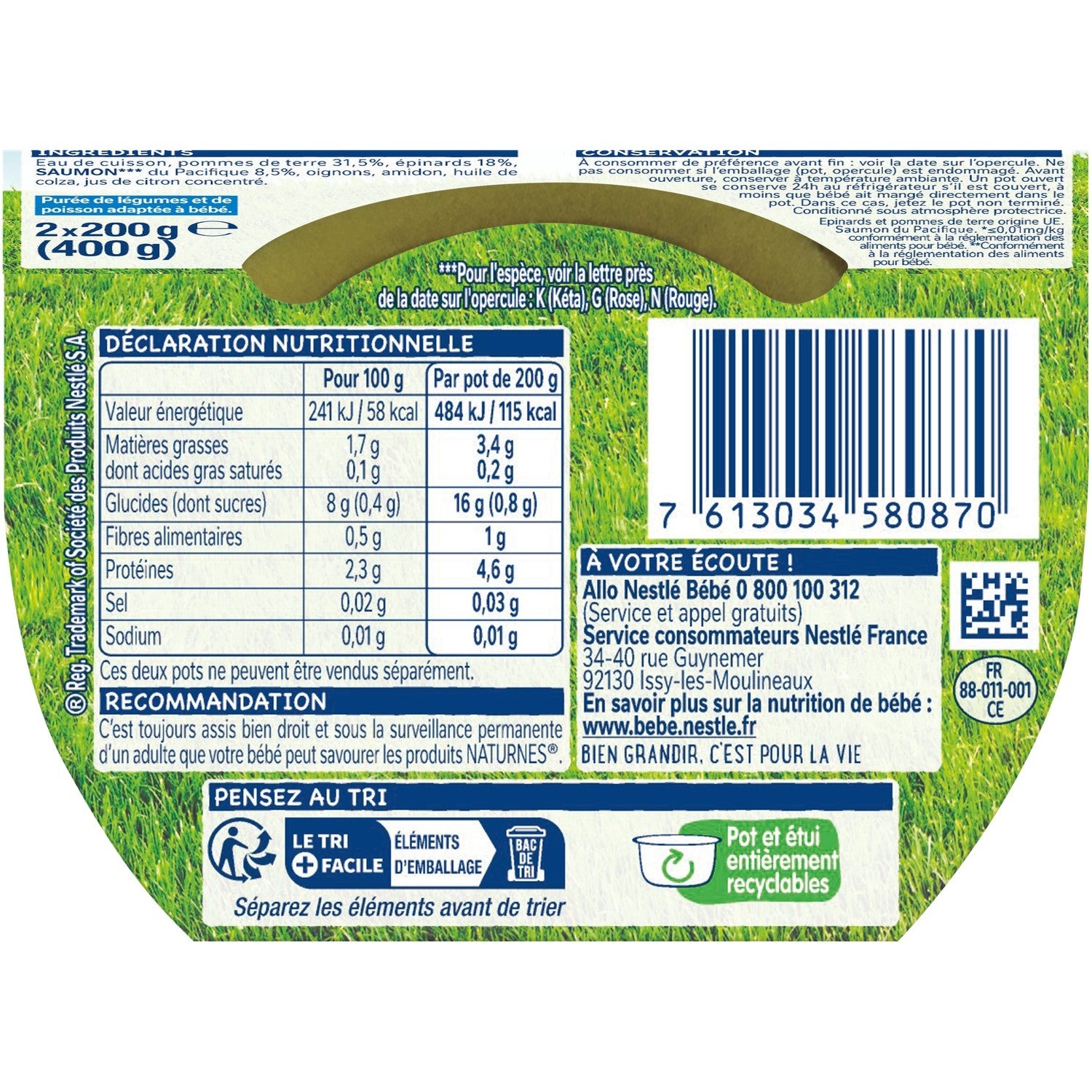 Wild fish,Each family of ingredients is cooked separately with gentle steam to preserve the taste,Produced in France in the Vosges; Spinach from France, Potatoes from France, Belgium and Spain, Salmon from the Northeast Pacific,No pesticide residues (< 0.01 mg/kg)¹ Ingredients 100% of natural origin ¹In accordance with the rules of infant feeding.,Low in salt, no preservatives¹, no coloring¹ ¹In accordance with the rules of infant feeding.,Small pieces adapted to the age of your baby¹¹In accordance with the rules of infant feeding.
