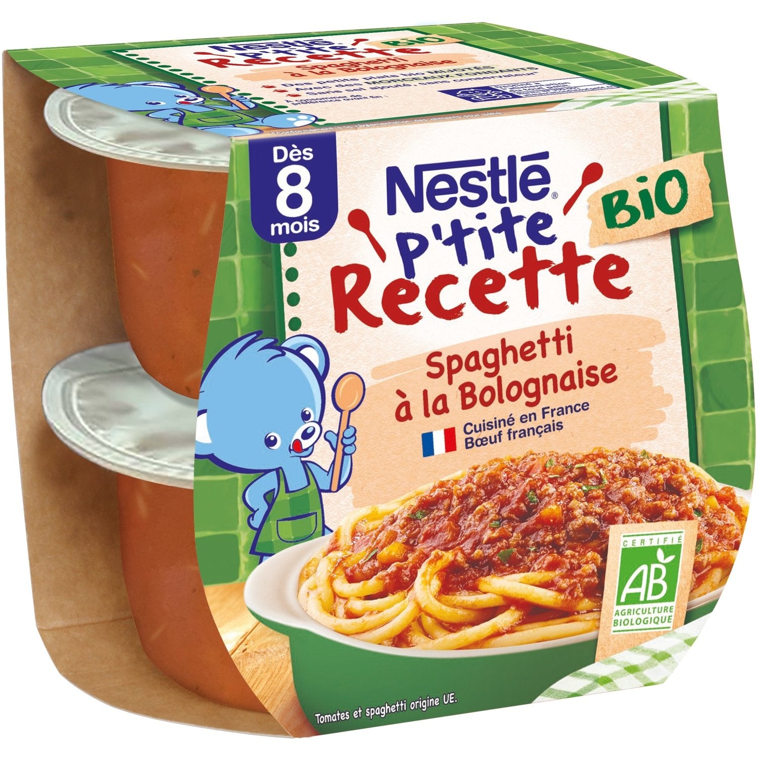 Take baby on a journey with our little organic dish, Little Organic Recipe: Spaghetti Bolognese: discover Italian flavors! A delicious little slow-cooked dish suitable for babies from 8 months* with soft pieces to introduce baby to new textures. Ingredients from Organic Farming, which contribute to respecting the environment and biodiversity**. Vegetables and minced beef simmered with a tomato sauce, a hint of basil and oregano accompanied by soft spaghetti to awaken baby to new Italian flavors. A recipe cooked in France with French beef. Tomato and spaghetti from the EU.