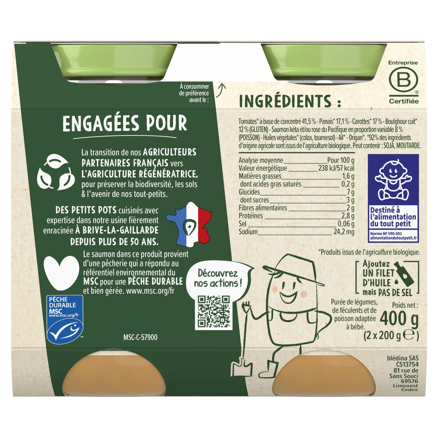 Ingredients: 1 small tomato* from concentrate 41.5% - 1/4 parsnip* - 1/3 carrot* - a little cooked bulgur* 12.0% (GLUTEN) - Chum salmon and/or Pacific pink salmon in varying proportions 8.00% (FISH) - Vegetable oils* (rapeseed, sunflower) - a hint of garlic* - a hint of oregano*. *92% of the ingredients of agricultural origin are from organic farming. May contain traces of: SOYA, MUSTARD.
