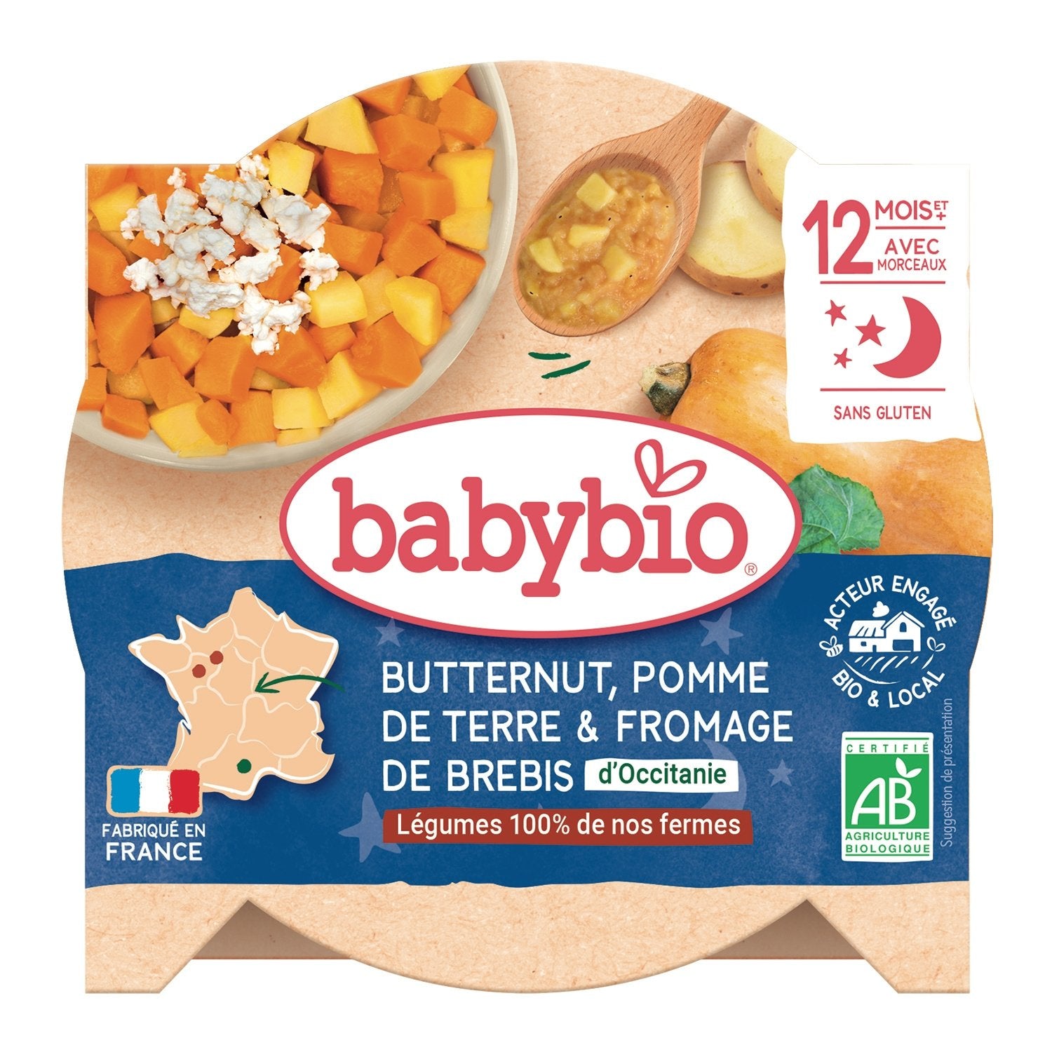 Butternut squash puree* 36% and potatoes* 36% from our farms, reconstituted skimmed milk powder from France* 21%, Occitanie sheep's cheese* 5%, cooking water, nutmeg*. *Ingredients from organic farming