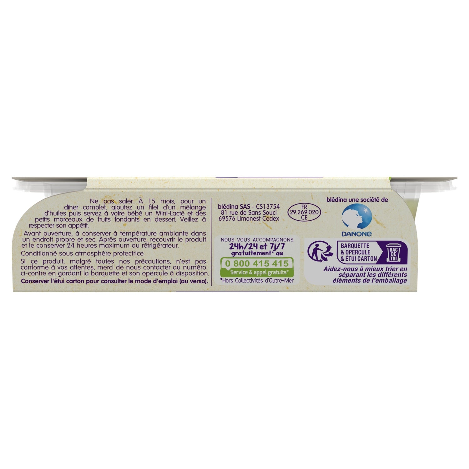 Experts in food diversification for over 100 years, Blédina is here to help you with all your baby's meals. Our mission? To awaken their curiosity for real food, thanks to over 250 recipes designed by nutritionists and perfectly adapted to their needs. Discover the new Blédina dish: PIECES TO DEVOUR Broccoli, peas, rice with mild spices. A complete evening meal made with perfectly recognizable ingredients to gradually teach your baby to eat like a grown-up, from 15 months to 3 years. Is baby ready? Offer this dish only if they: - Sit up and move around on their own - Eat dishes with more or less soft pieces - Eat a crust of bread