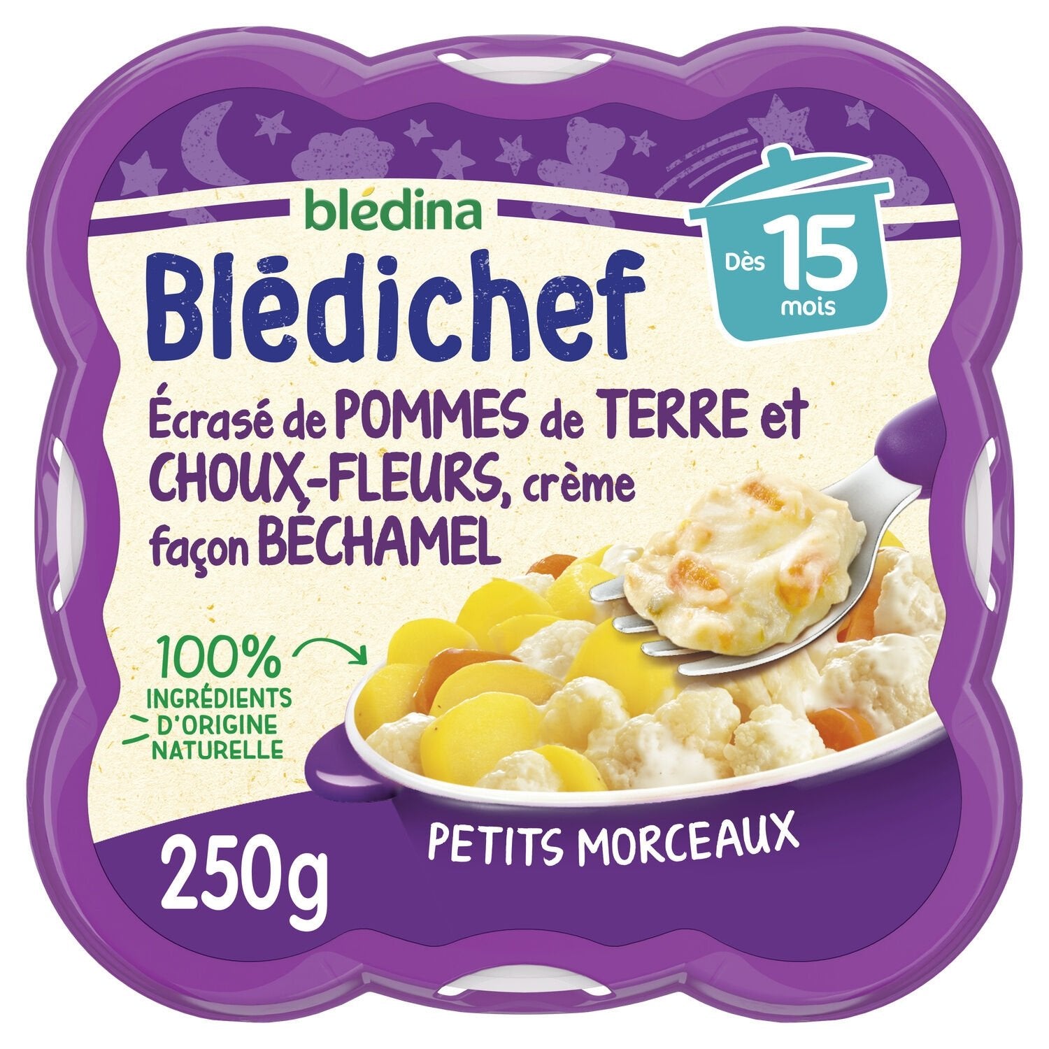 Experts in food diversification for over 100 years, Blédina is here to help you with all your baby's meals. Our mission? To awaken their curiosity for real food, thanks to over 250 recipes designed by nutritionists and perfectly adapted to their needs. Blédina Blédichef - Mashed Potatoes with Cauliflower and Béchamel-Style Cream from 15 months. The marriage of cauliflower and potato cooked béchamel-style for a gourmet BLEDICHEF dish that will delight baby's taste buds.