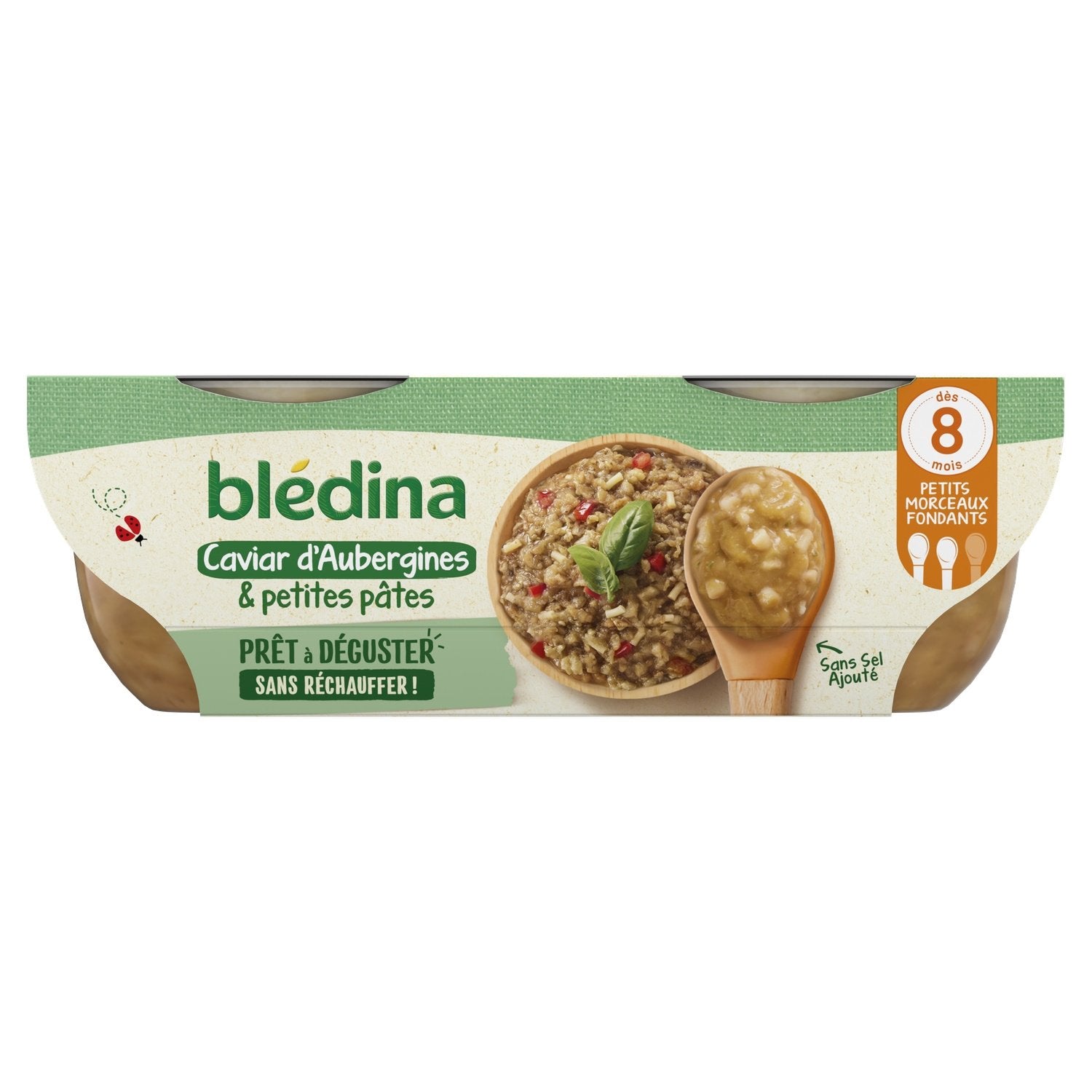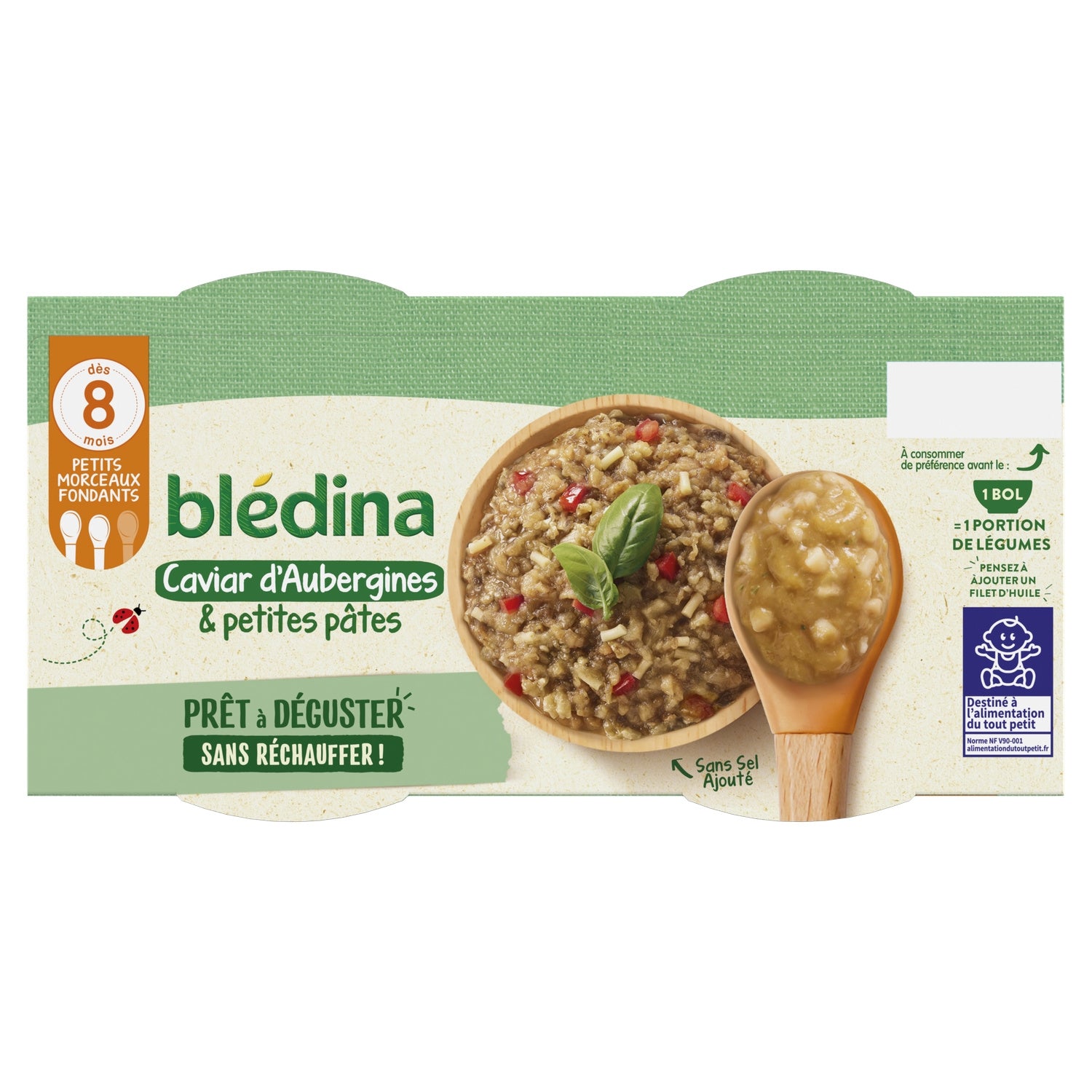 An expert in food diversification for over 100 years, Blédina is here to help you with all your baby's meals. Our mission? To awaken their curiosity about real food, thanks to over 250 recipes designed by nutritionists and perfectly adapted to their needs. BLEDINA - Eggplant caviar and small pasta. Ready to eat, without heating, with a specially redesigned, ground texture adapted to your baby. *In accordance with infant nutrition regulations.