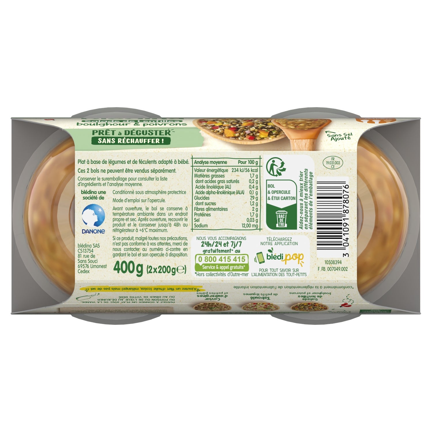 An expert in food diversification for over 100 years, Blédina is here to help you with all your baby's meals. Our mission? To awaken their curiosity about real food, thanks to over 250 recipes designed by nutritionists and perfectly adapted to their needs. BLEDINA - Lentil, bulgur, and pepper salad. Ready to eat, no need to heat, with a specially redesigned, ground texture adapted to your baby. *In accordance with infant nutrition regulations.