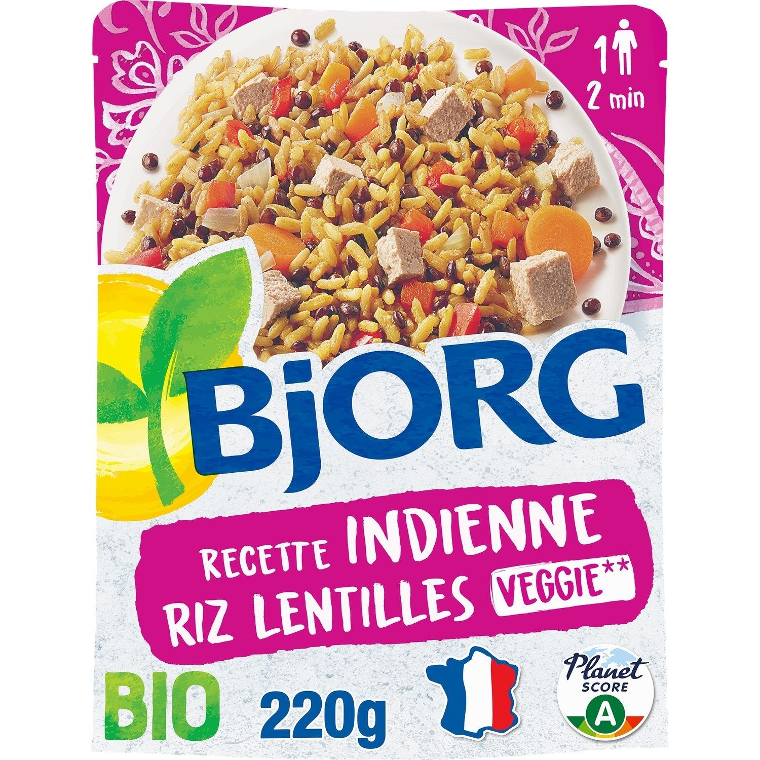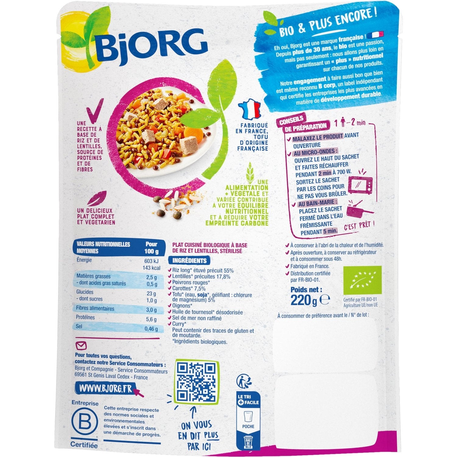 Precooked parboiled long grain rice* 55% (water, parboiled long grain rice*), precooked lentils* 17.8% (water, lentils*), red peppers*, carrots* 7.5%, tofu* (water, SOYA*, gelling agent: magnesium chloride) 5%, onions*, deodorized sunflower oil*, unrefined sea salt, curry*. *organic ingredients.