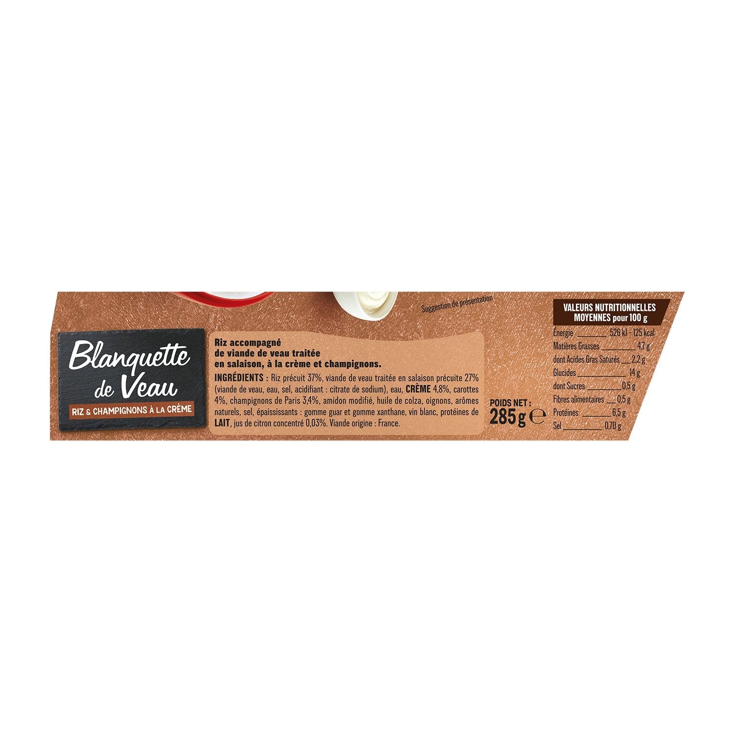 Precooked rice 37%, precooked cured veal 27% (veal, water, salt, acidifier: sodium citrate), water, CREAM 4.8%, carrots 4%, button mushrooms 3.4%, modified starch, rapeseed oil, onions, natural flavorings, salt, thickeners: guar gum and xanthan gum, white wine, MILK proteins, concentrated lemon juice 0.03%. Meat origin: France