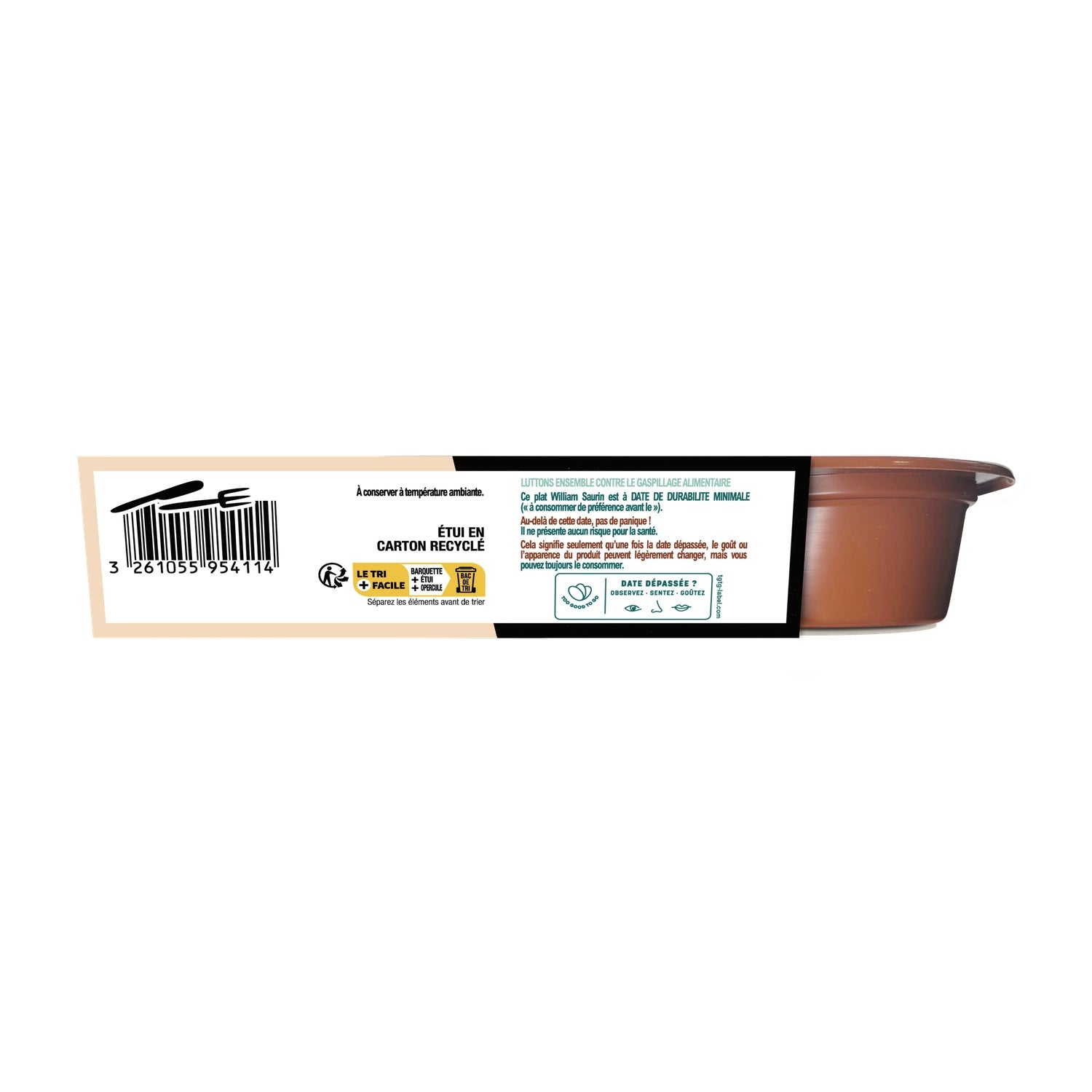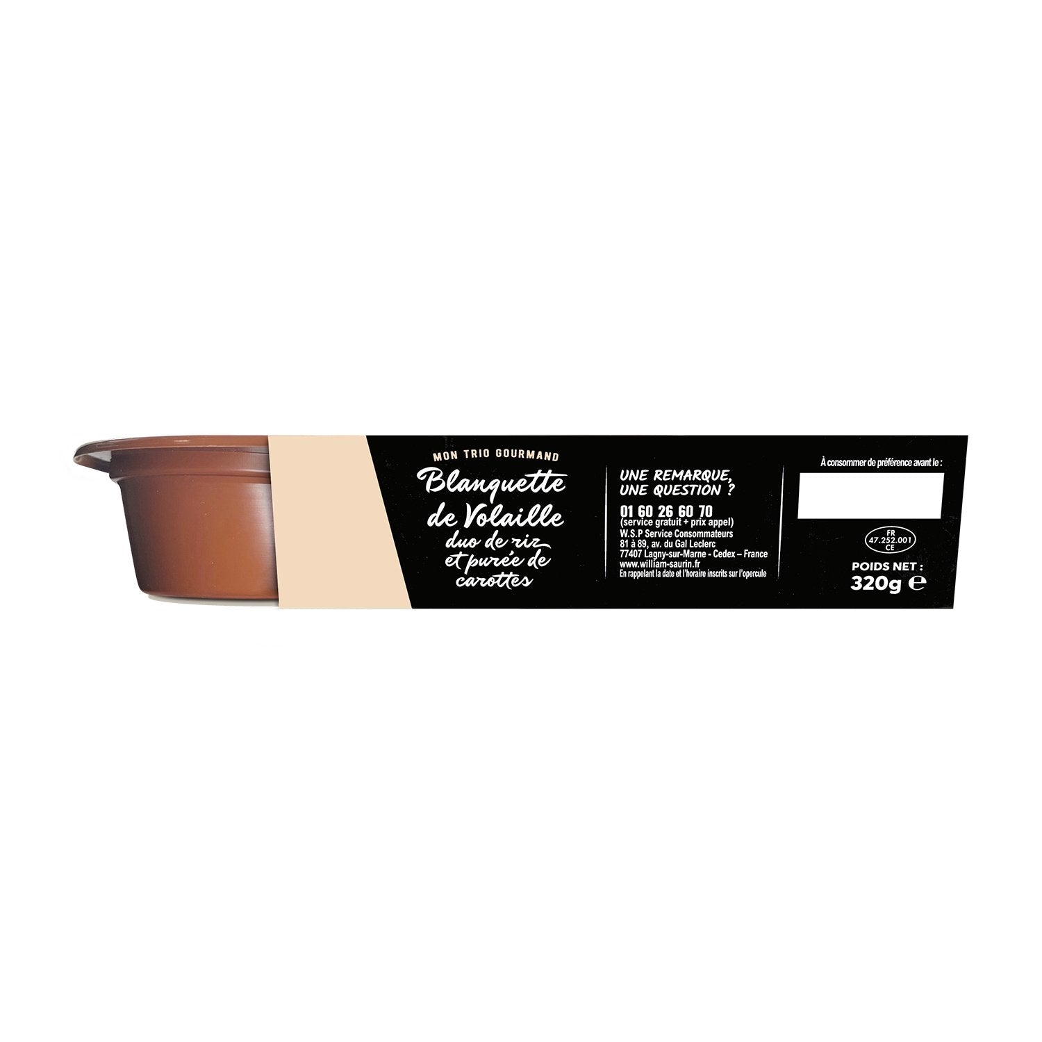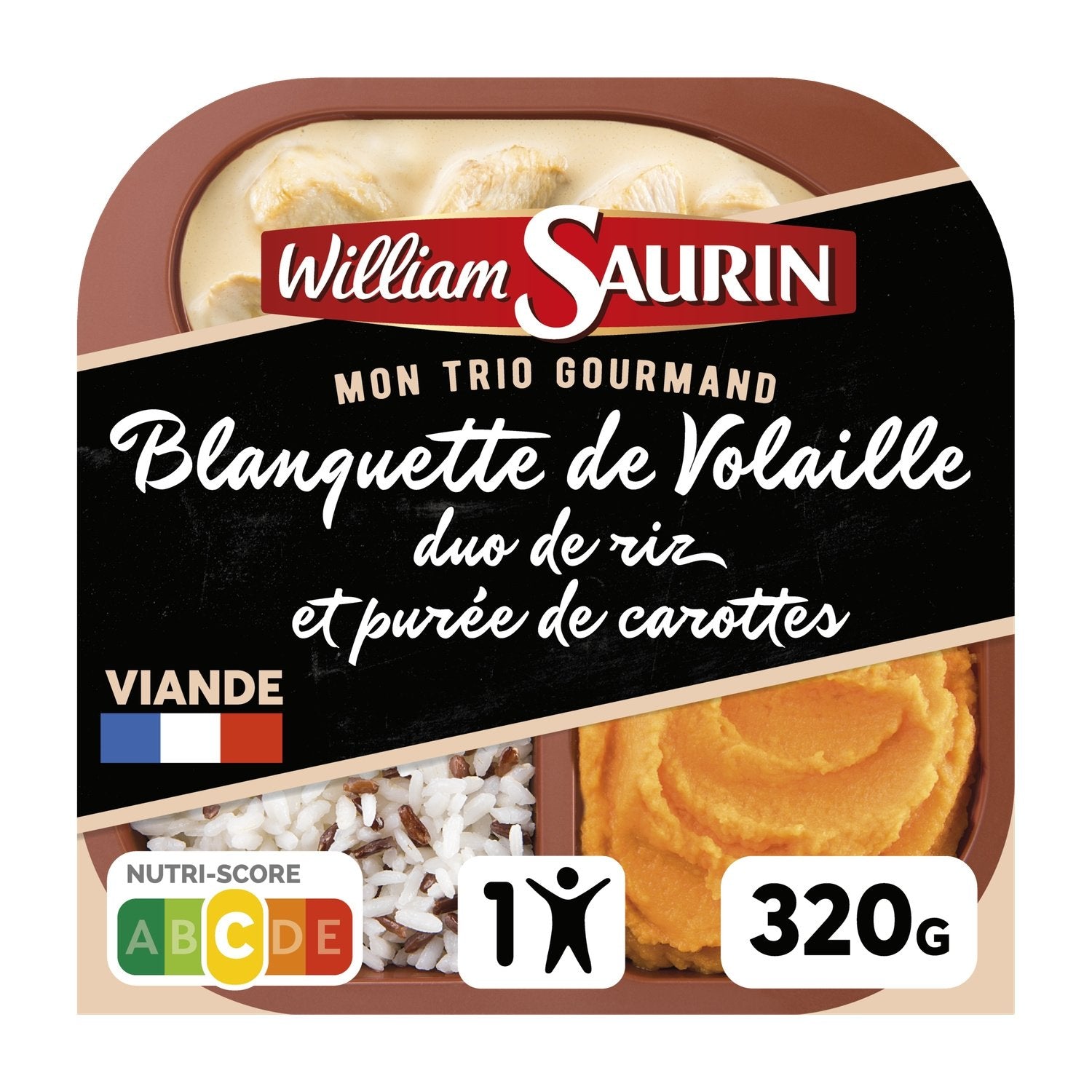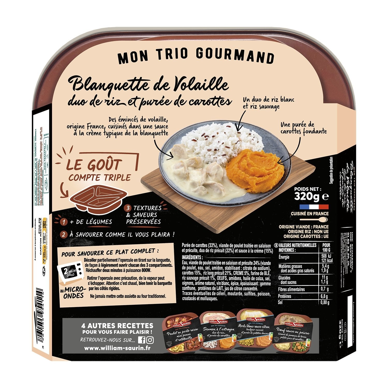 My Gourmet Trio Blanquette de Volaille, duo of rice and carrot puree Sliced poultry, from France, cooked in a cream sauce typical of blanquette A duo of white rice and wild rice A melting carrot puree Taste counts triple 1) + vegetables 2) To enjoy as you like! 3) Textures & flavors preserved Cooked in France Meat origin: France Rice origin: Non-EU Carrot origin: EU LET'S FIGHT TOGETHER AGAINST FOOD WASTE This dish, William Saurin, has a MINIMUM DURABILITY DATE ("best before"). Beyond this date, don't panic! It does not pose any health risk. This only means that once the date has passed, the taste or appearance of the product may change slightly, but you can still consume it. TOO GOOD TO GO (Look – Smell – Taste logo) Tgtg-label.com 4 other recipes to please you! Find us on Facebook (logo) Instagram (logo) www.william-saurin.fr