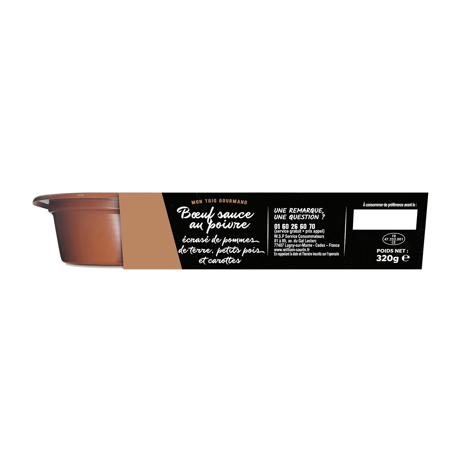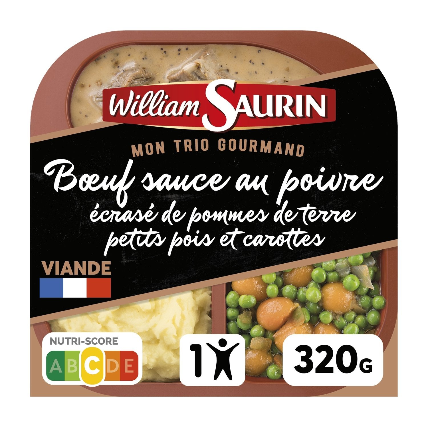 My Gourmet Trio Beef in Pepper Sauce, Mashed Potatoes, Peas and Carrots Tender pieces of French beef, cooked in a white and black pepper sauce, for a just-right taste! Mashed potatoes, with a hint of butter and cream Melting peas and carrots Taste counts triple 1) + vegetables 2) To be enjoyed as you please! 3) Textures & flavors preserved Cooked in France Meat origin: France Potato origin: EU Peas & carrot origin: EU LET'S FIGHT FOOD WASTE TOGETHER This William Saurin dish has a MINIMUM DURABILITY DATE ("best before"). Beyond this date, don't panic! It does not pose any health risk. This only means that once the date has passed, the taste or appearance of the product may change slightly, but you can still consume it. TOO GOOD TO GO (Look – Smell – Taste logo) Tgtg-label.com 4 other recipes to please you! Find us on Facebook (logo) Instagram (logo) www.william-saurin.fr