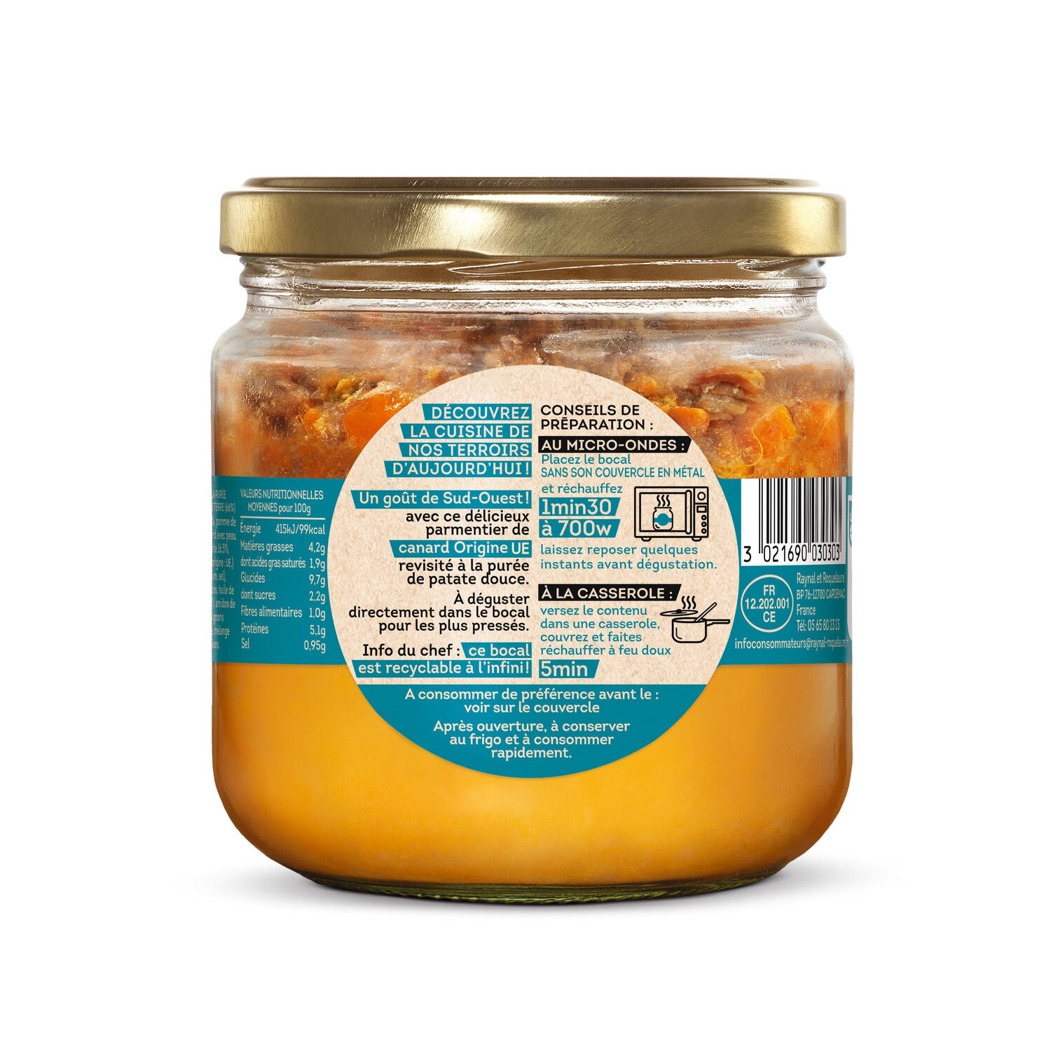 DISCOVER THE CUISINE OF OUR TERROIRS TODAY! A taste of the Southwest! with this delicious duck parmentier from France, revisited with sweet potato purée. Enjoy it directly from the jar for those in a hurry. Chef's tip: this jar is infinitely recyclable!