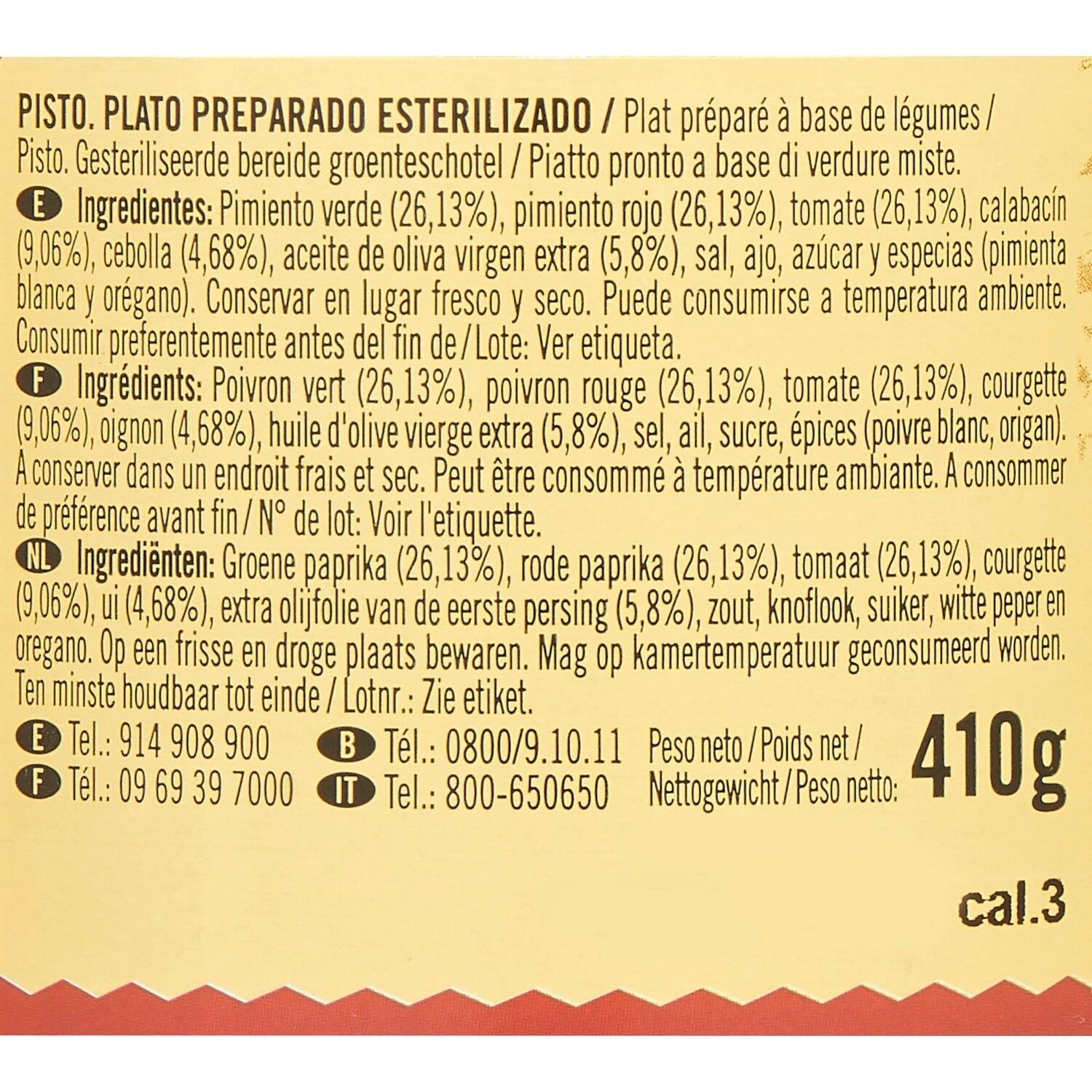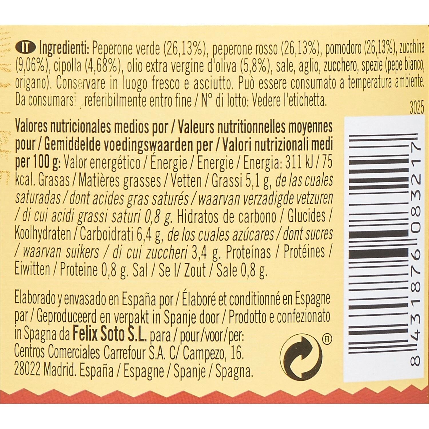 Green pepper (26.13%), red pepper (26.13%), tomato (26.13%), zucchini (9.06%), onion (4.68%), extra virgin olive oil (5.8%), salt, garlic, sugar, spices (white pepper, oregano).