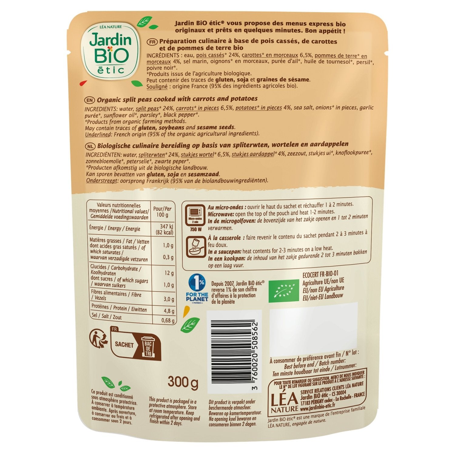 Because your time is precious and so is your diet, Jardin BiO étic offers you original organic express menus ready in just a few minutes. Discover this delicious recipe rich in fiber and protein, based on split peas cooked with small pieces of carrots and potatoes, and enhanced with garlic and herbs. Enjoy your meal! Split peas from France (subject to availability) Cooked in our organic cannery in France 1% for the planet ORGANIC No added flavors Rich in protein and fiber Ready in 2 minutes